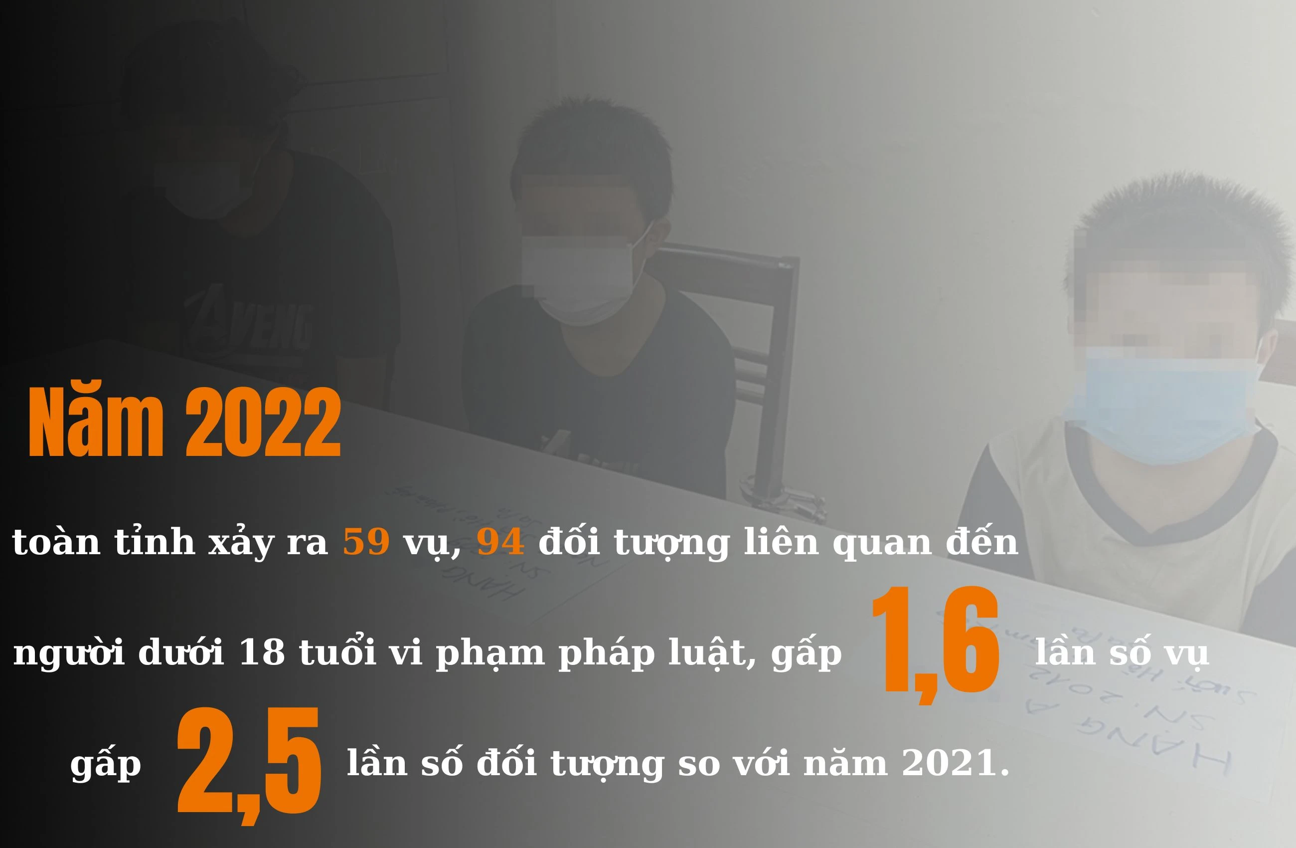 Theo số liệu thống kê của Phòng Cảnh sát hình sự Công an tỉnh, năm 2020, trên địa bàn tỉnh xảy ra 41 vụ/62 đối tượng phạm tội và vi phạm pháp luật liên quan đến người dưới 18 tuổi, so với năm 2019 tăng 3 vụ, tăng 24 đối tượng; năm 2021, toàn tỉnh xảy ra 36 vụ với 38 đối tượng. Năm 2022, tình trạng người chưa thành niên vi phạm pháp luật có xu hướng tăng, với 59 vụ, 94 đối tượng, gấp 1,6 lần số vụ và 2,5 lần số đối tượng so với năm trước đó. Trong số này, cơ quan chức năng đã khởi tố 30 vụ với 39 bị can; xử lý hành chính 17 vụ với 37 đối tượng.