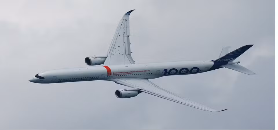 Một chiếc Airbus A350-1000 trình diễn tại Triển lãm Hàng không Singapore tại Trung tâm Triển lãm Changi ở Singapore, ngày 20/2/ 2024.