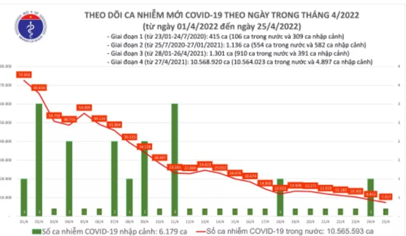 - Tính từ 16h ngày 24/4 đến 16h ngày 25/4, trên Hệ thống Quốc gia quản lý ca bệnh COVID-19 ghi nhận 7.417 ca nhiễm mới, tất cả đều ghi nhận trong nước (giảm 1.395 ca so với ngày trước đó) tại 60 tỉnh, thành phố (có 5.327 ca trong cộng đồng).