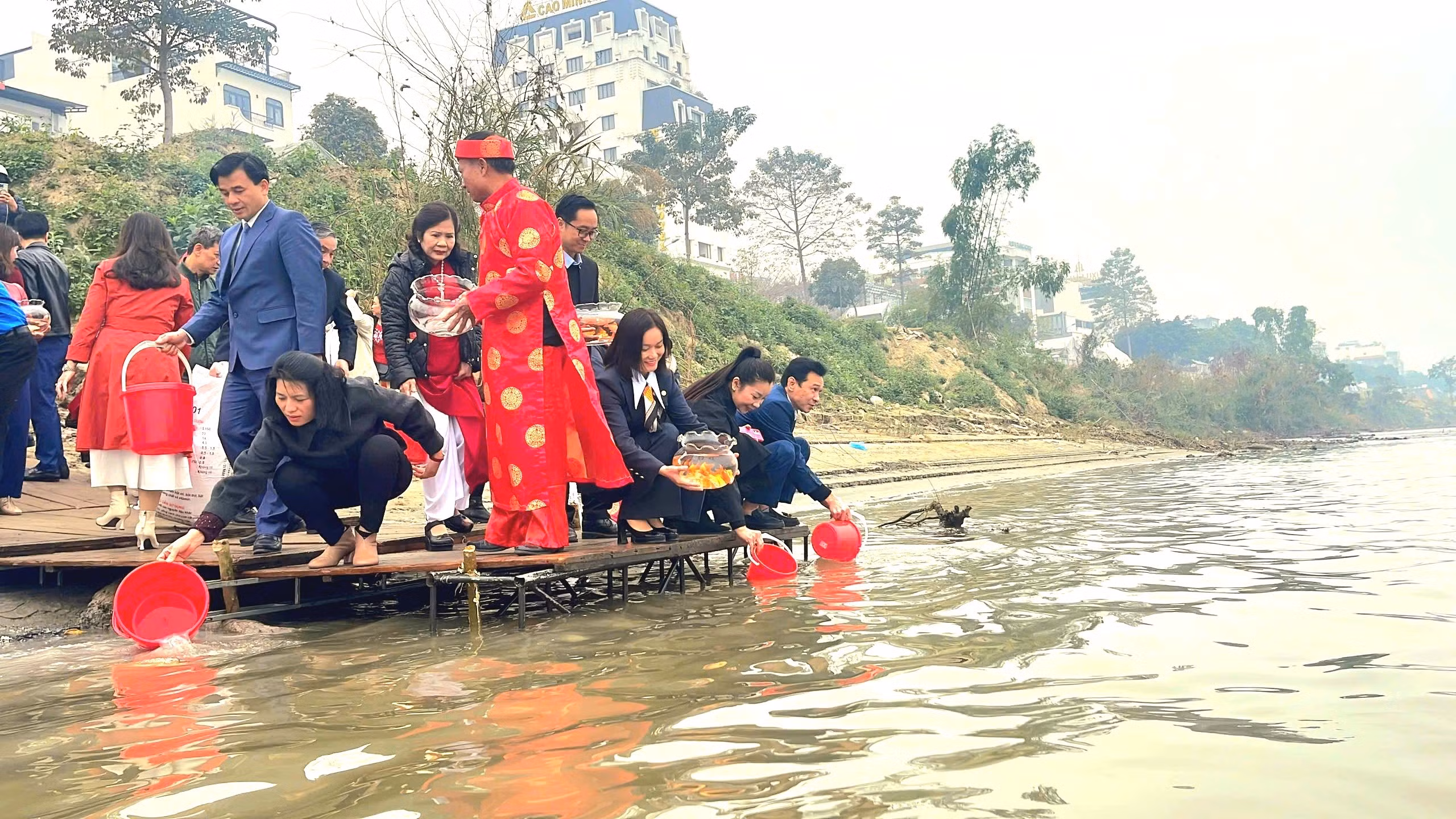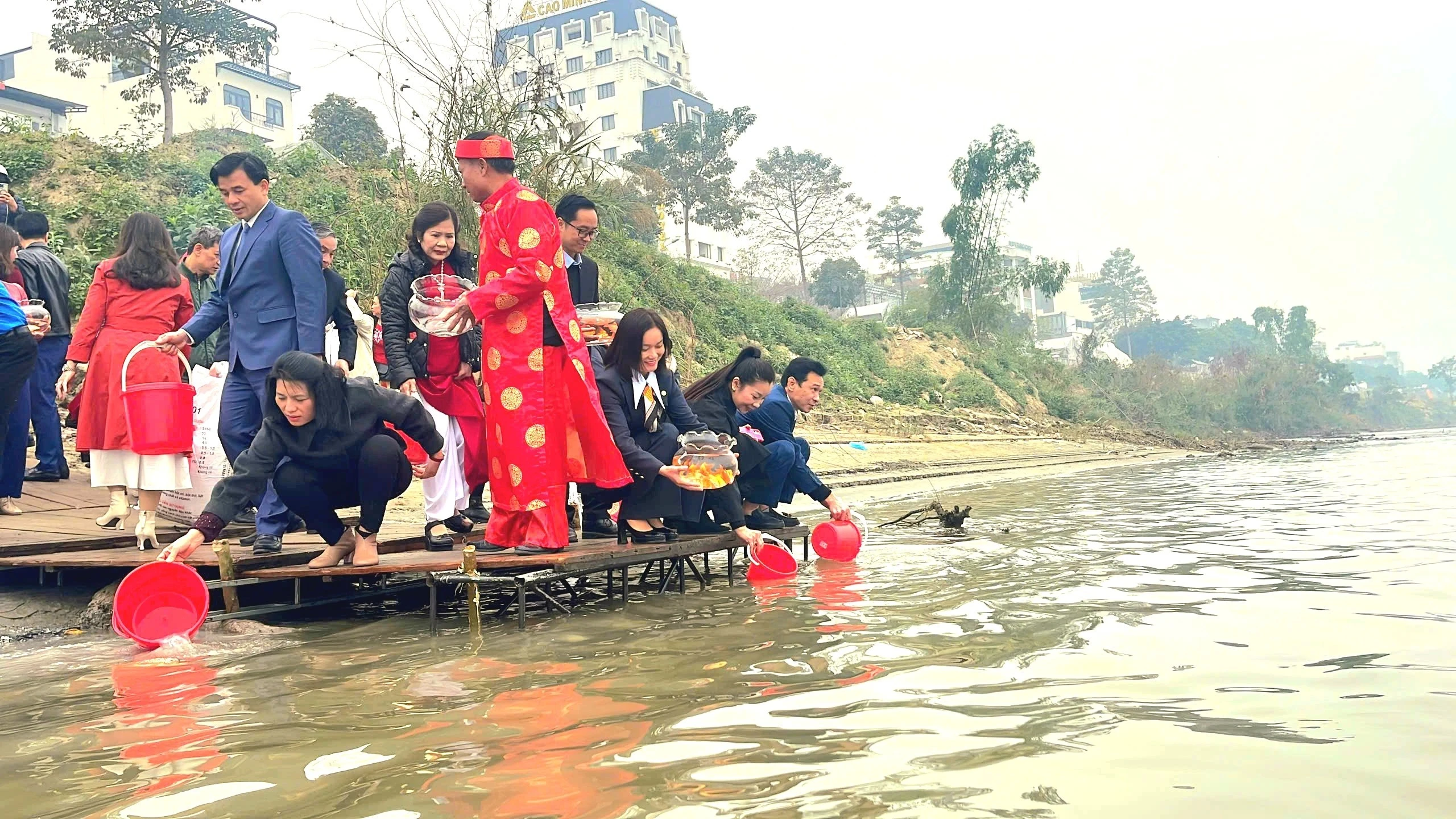 Từ sáng sớm ngày 23 tháng Chạp, rất đông người dân đã có mặt tại bờ kè sông Hồng để phóng sinh cá. Hầu hết, người dân thả cá có ý thức giữ gìn vệ sinh môi trường, góp phần tái tạo, phục hồi nguồn lợi thủy sản cho địa phương.