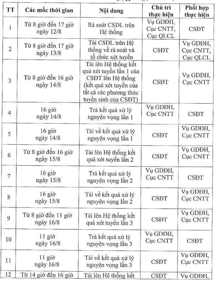Trước 17h ngày 17/8, các trường sẽ nhập mức điểm trúng tuyển và kết quả xét tuyển lên hệ thống, rà soát và chuẩn bị công bố kết quả trúng tuyển đại học, cao đẳng ngành giáo dục mầm non đợt 1 năm 2024.