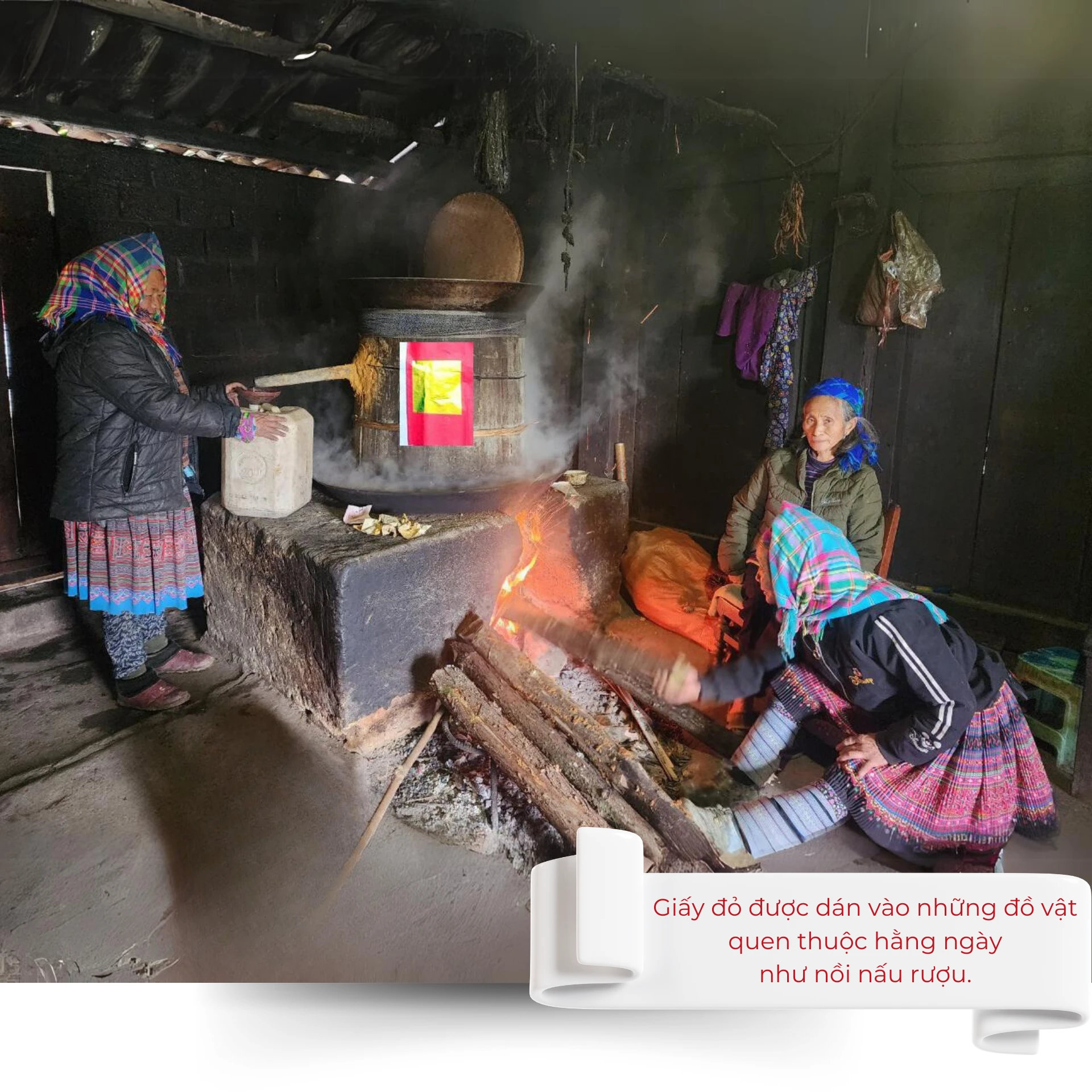 Tiếp đó sẽ khấn xin phép thực hiện nghi lễ dán giấy đỏ cầu may và mừng tuổi đồ vật, nông cụ trong nhà. Đầu tiên, người ta dán 3 miếng giấy đỏ lên đỉnh ban thờ, một miếng dán vào ống hương, sau đó chọn một cây cột chính trong nhà để dán. Tiếp theo sẽ xuống bếp dán vào vị trí chính giữa của bếp đun thường ngày rồi đến các vật khác như nồi nấu rượu, địu (lù cở), cối xay ngô, cối giã bánh dày… Cuối cùng sẽ dán cho các đồ nông cụ như dao, cuốc, cày… rồi mang vào chân bàn thờ tổ tiên dựng trong 3 ngày tết. Nghi lễ dán giấy đỏ của người Mông hoa nhằm cầu mong năm mới gặp nhiều may mắn, sung túc, đủ đầy, đồng thời cũng xem như sự tri ân công cụ sản xuất.