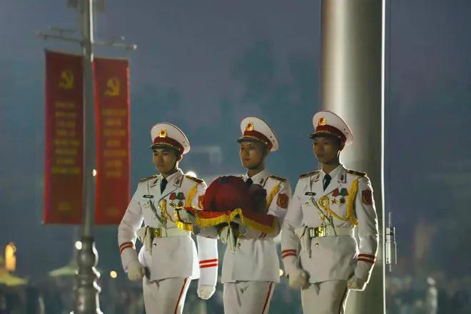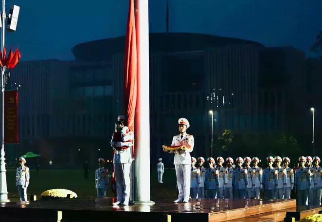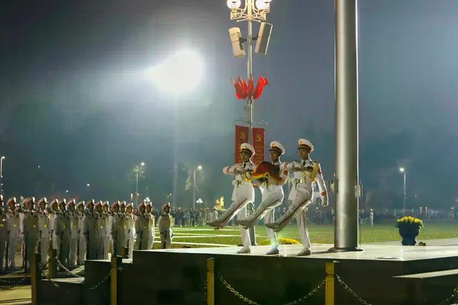 Hàng ngày, đúng 6 giờ sáng (mùa hè) hoặc 6 giờ 30 sáng (mùa đông), đoàn tiêu binh gồm 37 chiến sĩ cùng Quân kỳ Quyết thắng tiến vào quảng trường trong tiếng nhạc "Tiến bước dưới quân kỳ". Trong những ngày cả nước hướng về Đại hội XIV, không gian nơi đây càng thêm linh thiêng, thu hút đông đảo người dân và du khách.