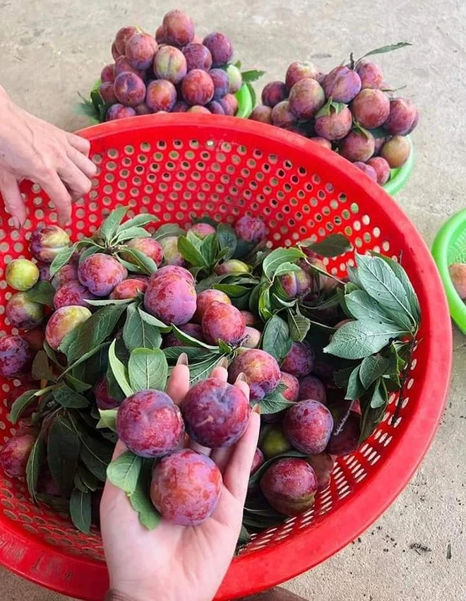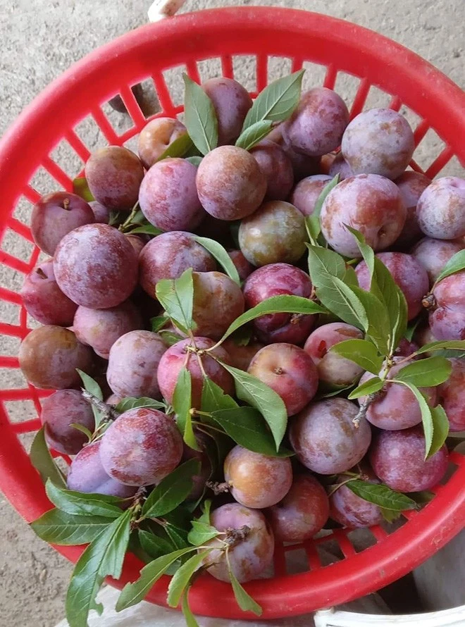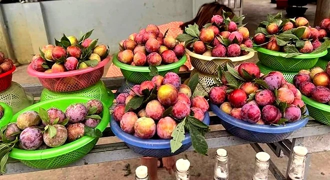Những quả mận còn nguyên phấn trắng, được xếp đầy trong từng chiếc rổ thu hút bất kỳ ai đi qua. (Ảnh: FB Bản tin Văn Chấn)
