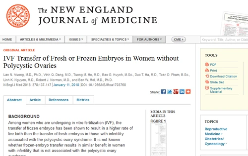 Kết quả nghiên cứu có tiêu đề: “IVF Transfer of Fresh or Frozen Embryos in Women without Polycystic Ovaries” (tạm dịch: Thụ tinh trong ống nghiệm bằng việc chuyển phôi tươi hoặc đông lạnh ở phụ nữ không có buồng trứng đa nang”) được đăng toàn bộ trên Tạp chí NEJM ngày 11/1/2018.