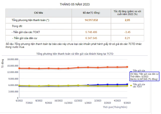 Thống kê mới công bố từ Ngân hàng Nhà nước cho biết, tính đến cuối tháng 5, tổng tiền gửi của dân cư tại các tổ chức tín dụng là 6,347 triệu tỷ đồng, tương đương tăng đến 8,21% so với cuối năm 2022.