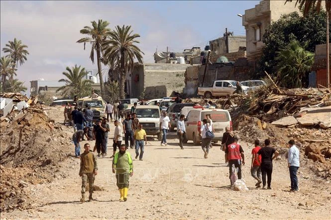 Người dân di dời khỏi khu vực đổ nát do lũ quét, gây ra bởi cơn bão Daniel, ở thành phố miền Đông Derna, Libya ngày 14/9/2023.