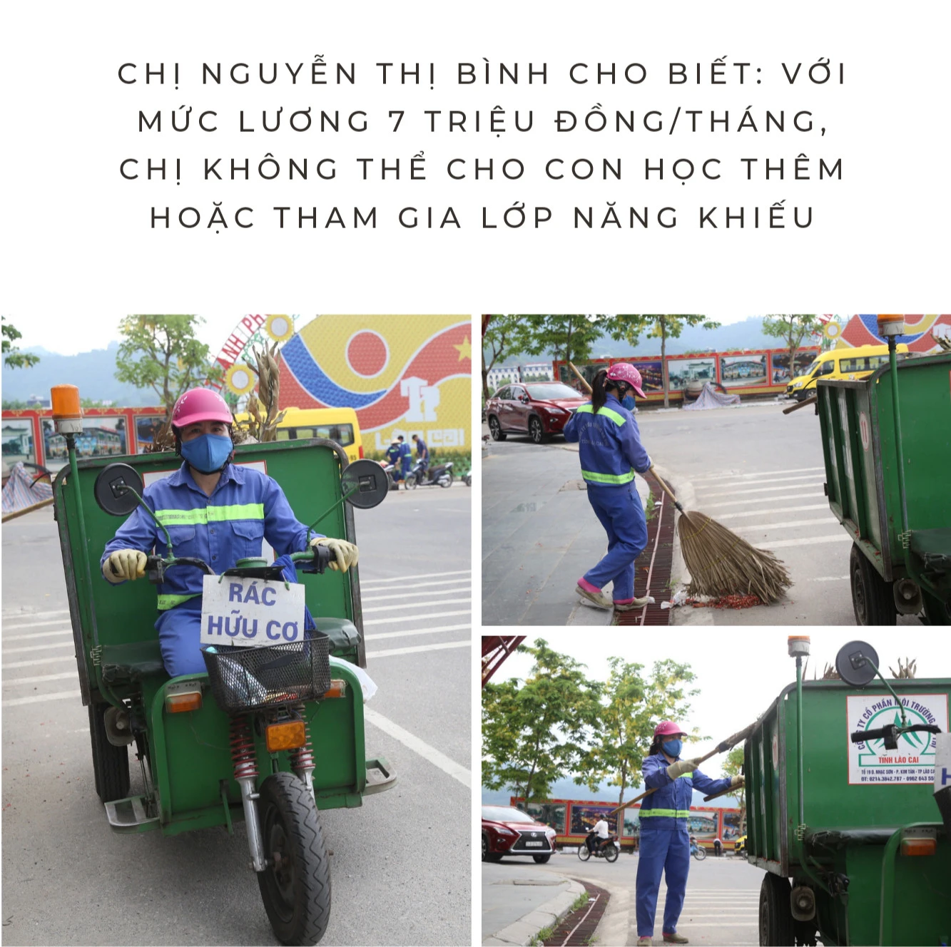 Chị Bình là công nhân của Công ty Cổ phần Môi trường đô thị Lào Cai, chồng chị làm việc tự do, mức thu nhập bình quân của hai vợ chồng được 12 triệu đồng/tháng. Công việc của chị Bình rất vất vả, buổi sáng bắt đầu thu gom, dọn dẹp rác từ 4 giờ, ngày làm việc kết thúc lúc 22 giờ. Chị và đồng nghiệp phụ trách vệ sinh một đoạn đường Hoàng Liên, Soi Tiền và An Dương Vương. Nếu một tháng không ốm đau, làm đủ 26 công thì chị Bình được trả lương 7,5 triệu đồng.