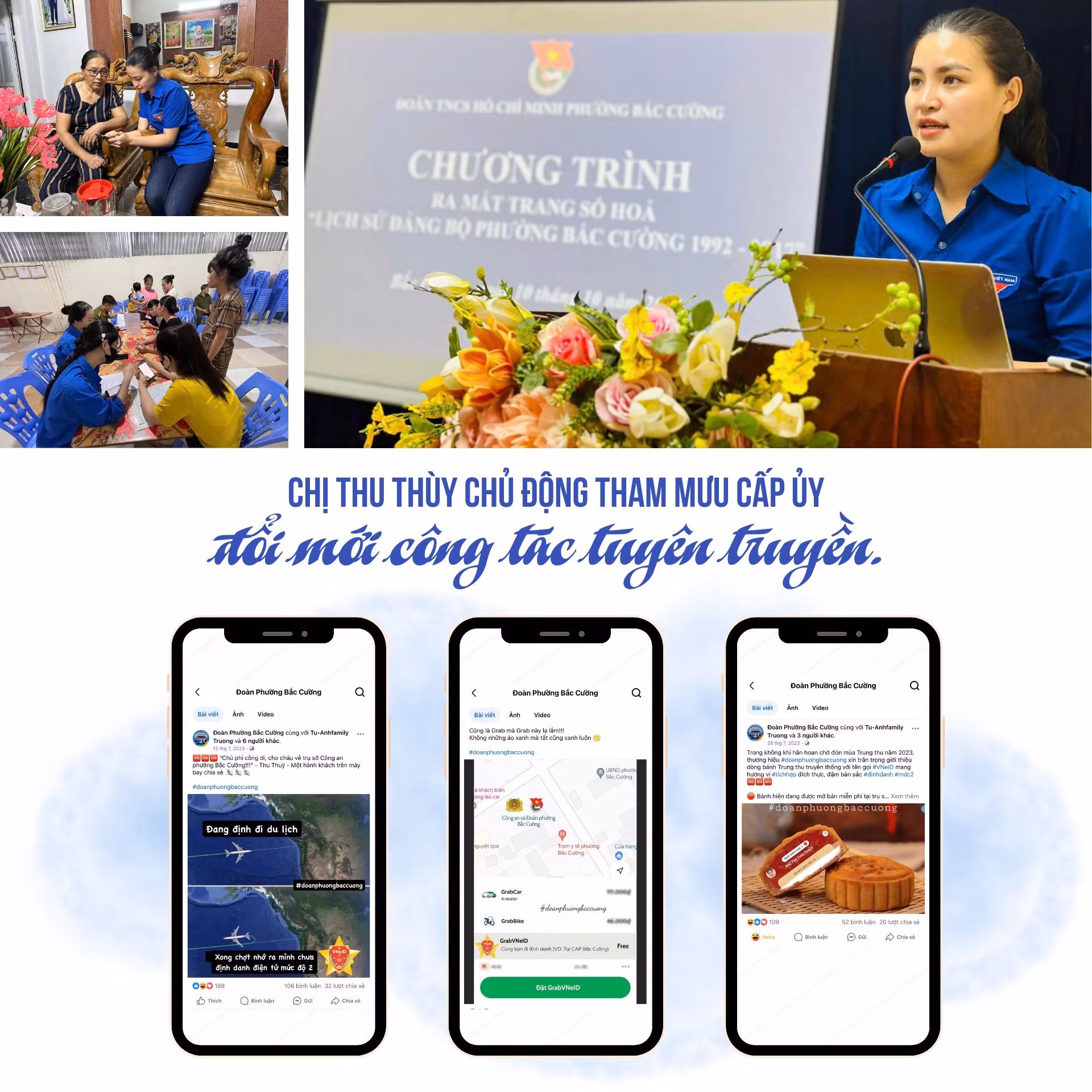 Phí Thị Thu Thùy vốn là sinh viên Đại học Bách khoa Hà Nội, kiến thức học trong trường, cộng với thời gian làm việc tại các doanh nghiệp đã giúp chị chắc chắn về công nghệ, chuyển đổi số. Do đó, khi về công tác tại phường Bắc Cường, chị Thùy có nhiều tham mưu, sáng kiến trong xây dựng website số hóa “Lịch sử Đảng bộ phường Bắc Cường (1992 - 2017)” dưới dạng văn bản, nhằm tăng cường tuyên truyền, giáo dục truyền thống lịch sử và công tác tuyên truyền của Đảng, của Đoàn cũng như hỗ trợ cán bộ, đảng viên và người dân khai thác tài liệu dễ dàng hơn; tham mưu xây dựng mô hình và duy trì mô hình “Chợ 4.0” tại chợ Châu Úy, “Tuyến phố thanh toán không dùng tiền mặt” tại tuyến phố Châu Úy với sự tham gia của 86/86 hộ kinh doanh.