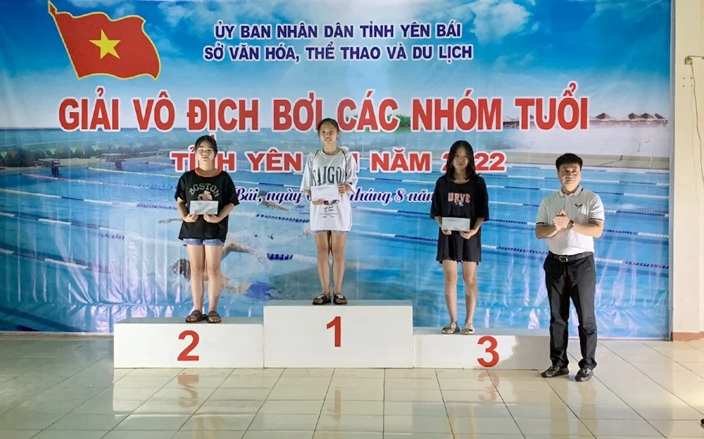 Cô trò nhỏ Nguyễn Phương Thảo (đứng ở bục giải Nhất) không chỉ học giỏi mà còn có rất nhiều tài lẻ. Ảnh: Thảo nhận giải cao nhất trong một nội dung ở Giải vô địch bơi các nhóm tuổi tỉnh Yên Bái năm 2022.
