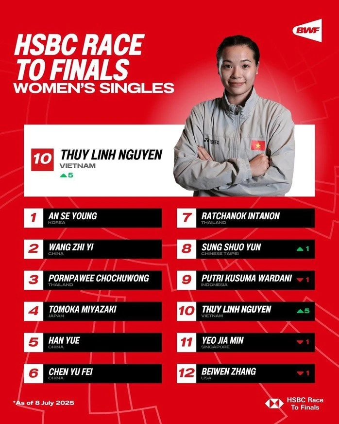 Đáng chú ý, Thùy Linh hiện cũng giữ vị trí top 10 bảng xếp hạng BWF World Tour Finals 2025. Nếu duy trì thứ hạng và lọt vào top 8, cô sẽ trở thành tay vợt cầu lông Việt Nam thứ hai, sau Nguyễn Tiến Minh, góp mặt ở giải đấu danh giá cuối năm, nơi có tổng tiền thưởng cao nhất của hệ thống thi đấu quốc tế.
