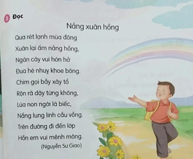 Đó là sách giáo khoa tiếng Việt 1, tập 1, bộ Kết nối tri thức với cuộc sống. Trong đó nhà thơ Nguyễn Sư Giao có bài thơ Nắng xuân hồng, nằm ở trang 179. Còn trang 180, đó là bài Hoa giấy của nhà thơ Nguyễn Lãm Thắng.