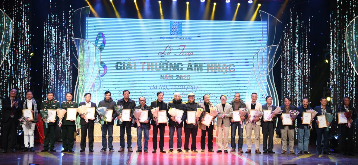Nhạc sỹ Phùng Chiến (ngoài cùng bên phải ảnh) cùng các nhạc sỹ nhận Giải B Giải thưởng Âm nhạc 2020.