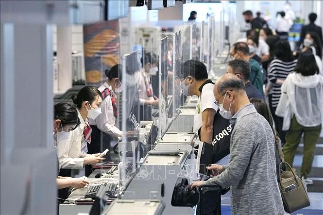Hành khách làm thủ tục tại sân bay Haneda ở Tokyo, Nhật Bản, ngày 28/4/2022. Ảnh: Kyodo/TTXVN