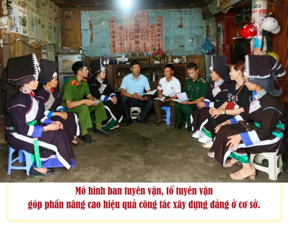 Thực tế, cách đây hơn 10 năm, Lào Cai đã tiến hành sắp xếp các đơn vị để tinh gọn bộ máy với những mô hình chưa từng có trong cả nước, mang tính đột phá, thậm chí gợi ý cho các địa phương và Trung ương xem xét, có thể áp dụng. Trước hết, phải kể đến mô hình Ban Tuyên vận tại cơ sở. Qua tổng kết thực tiễn, từ năm 2012, Tỉnh ủy Lào Cai nhận thấy giữa công tác tuyên giáo và công tác dân vận có nhiều điểm tương đồng, gắn kết mật thiết với nhau. Do quy định về tổ chức bộ máy 2 cơ quan ở cấp tỉnh và cấp huyện đang duy trì ổn định, ở cấp xã các lực lượng “báo cáo viên, cộng tác viên, tuyên truyền viên” tham gia làm công tác tuyên truyền miệng khá đông, thành phần tham gia ban tuyên giáo và khối dân vận ở xã phần lớn trùng nhau, hoạt động không thường xuyên, tuyên truyền còn chồng lấn, thậm chí không ít nơi thiếu thống nhất trong tuyên truyền, vận động. Từ thực trạng đó, Tỉnh ủy Lào Cai đã chỉ đạo triển khai mô hình tuyên vận ở cấp xã (ban tuyên vận xã, phường, thị trấn; tổ tuyên vận thôn, bản, tổ dân phố). Năm 2012, thực hiện thí điểm và đến năm 2016, tất cả xã, phường, thị trấn trong tỉnh đã thực hiện mô hình tuyên vận. Sự ra đời của ban tuyên vận, tổ tuyên vận đã mang lại hiệu quả nổi bật, quan trọng về tăng cường công tác xây dựng Đảng ở cơ sở.