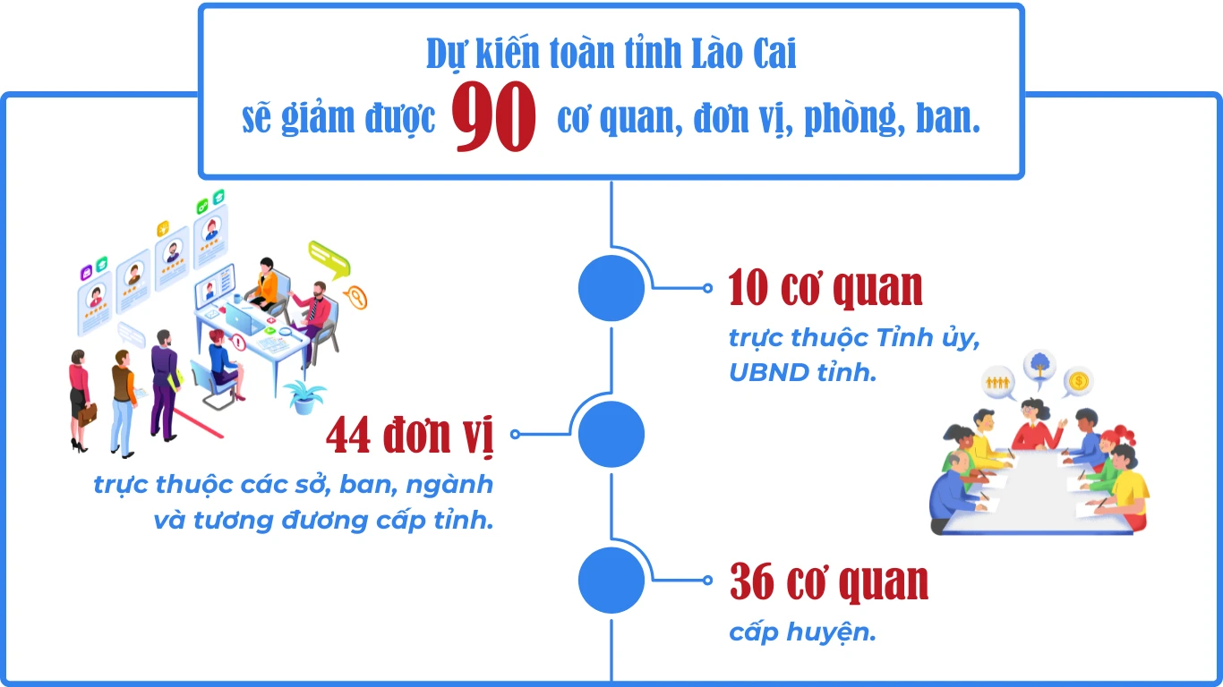 Hơn 10 năm “làm nhẹ mình” đã giúp Lào Cai có được kinh nghiệm để tiếp tục thực hiện cuộc cách mạng sắp xếp, tinh gọn bộ máy theo chỉ đạo của Trung ương, Bộ Chính trị đảm bảo 3 yếu tố cốt lõi: Hiệu năng, hiệu lực và hiệu quả. Theo đó, Tỉnh ủy Lào Cai đã ban hành các văn bản chỉ đạo, tập trung triển khai sắp xếp, kiện toàn tổ chức bộ máy trong toàn hệ thống chính trị; coi đây là nhiệm vụ chính trị đặc biệt quan trọng và các nội dung trong công tác chuẩn bị đang được tiến hành khẩn trương. Quan điểm chỉ đạo của tỉnh là tất cả cơ quan, đơn vị, tổ chức đều phải thực hiện rà soát, sắp xếp, tinh gọn tổ chức, tinh gọn bên trong, đảm bảo bộ máy hoạt động tốt hơn, hiệu quả hơn; tổ chức hợp lý các sở, ban, ngành theo hướng quản lý đa ngành, đa lĩnh vực, trên nguyên tắc 1 cơ quan thực hiện nhiều việc và 1 việc chỉ giao cho 1 cơ quan chủ trì; thực hiện việc sắp xếp phải đảm bảo đi đôi với phân cấp, phân quyền và chức năng nhiệm vụ của tổ chức, thống nhất với quy định của cấp trên; rà soát kỹ lưỡng, tránh trùng lặp hoặc bỏ sót chức năng, nhiệm vụ; kiên quyết ghép những đơn vị có chức năng, nhiệm vụ tương đồng; những tổ chức, đơn vị không rõ nhiệm vụ thì tiến hành giải thể.