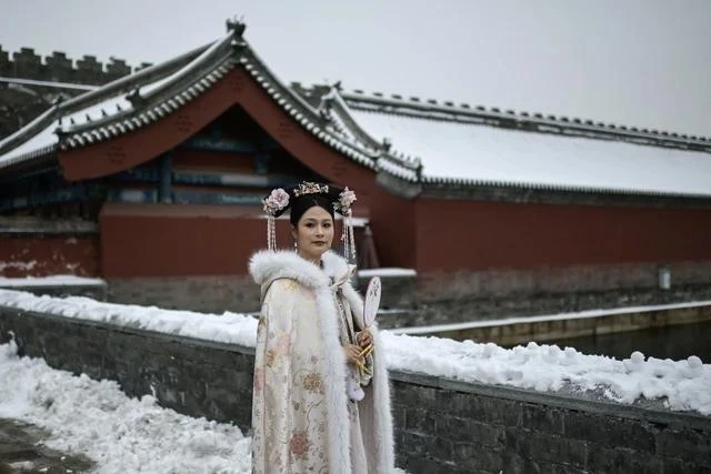 Bất chấp thời tiết giá lạnh ở khu vực Cố Cung, một địa điểm tham quan nổi tiếng, một số người mặc trang phục truyền thống vẫn tỏ ra hứng thú trước cảnh tuyết rơi đẹp như tranh vẽ.
