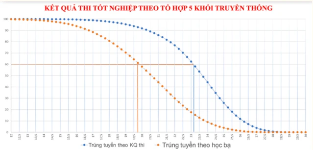 Bộ Giáo dục và Đào tạo (GD&ĐT) phân tích kết quả điểm thi tốt nghiệp THPT của hai nhóm thí sinh trúng tuyển đại học bằng phương thức xét học bạ và xét bằng điểm thi tốt nghiệp THPT. Kết quả cho thấy có 60% thí sinh trúng tuyển bằng học bạ có tổng điểm thi tốt nghiệp THPT theo tổ hợp 3 môn khoảng 20 điểm. Trong khi đó, 60% thí sinh trúng tuyển bằng phương thức xét điểm thi tốt nghiệp THPT có điểm thi tốt nghiệp THPT 3 môn trên 23 điểm.