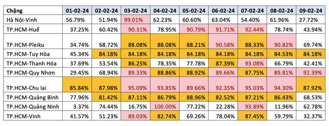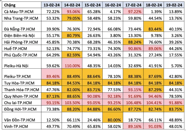 Với các đường bay trục như TPHCM - Đà Nẵng, TPHCM - Hà Nội, Hà Nội - Đà Nẵng, Hà Nội - TPHCM, giai đoạn từ ngày 3 - 15/2/2024 (từc từ 24 tháng Chạp tới mùng 6 Tết) tỷ lệ đặt vé chưa cao, trung bình từ 30 - 40%.