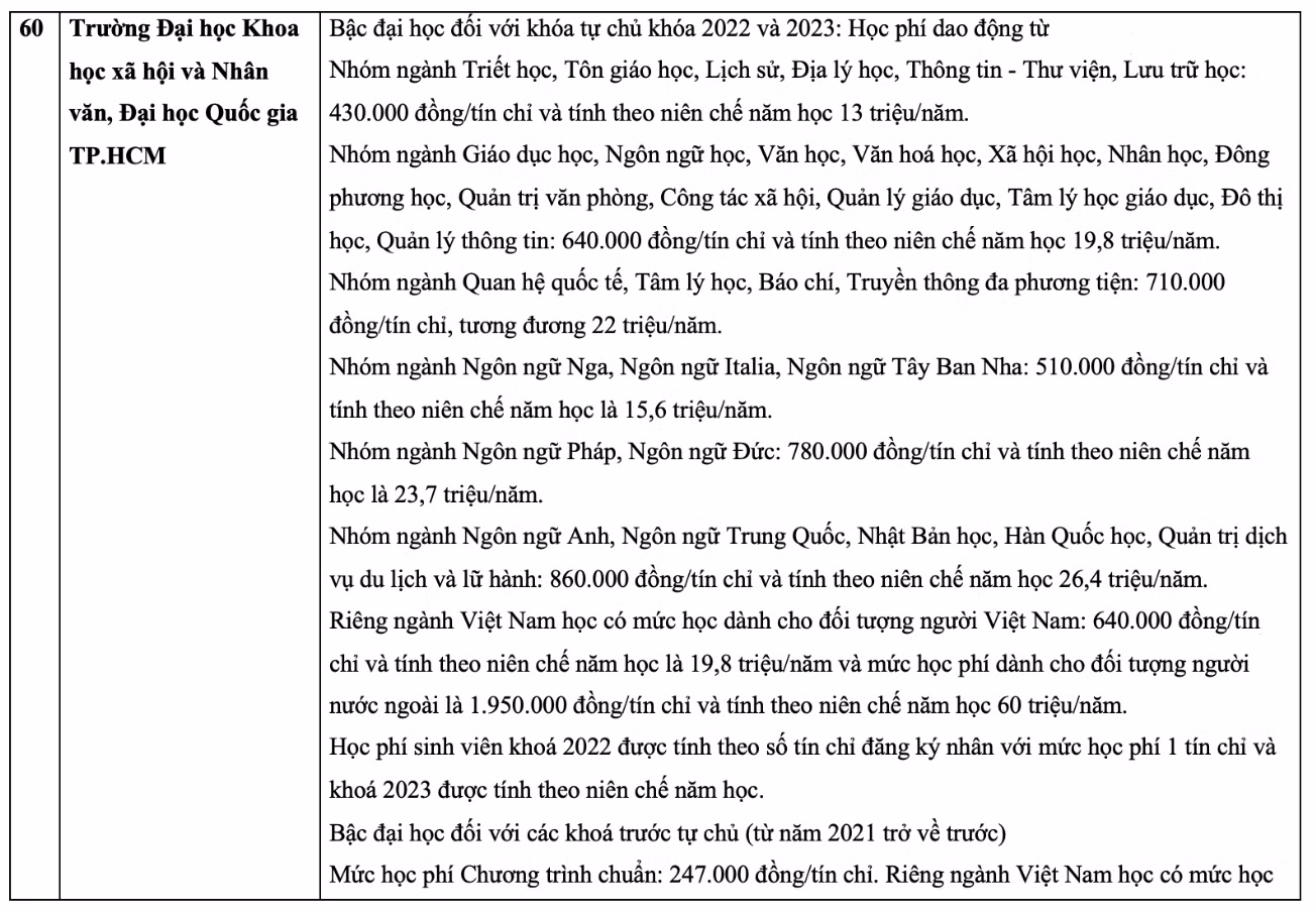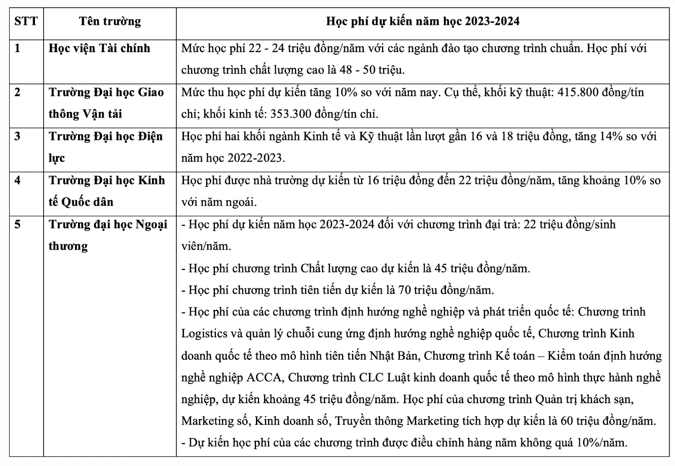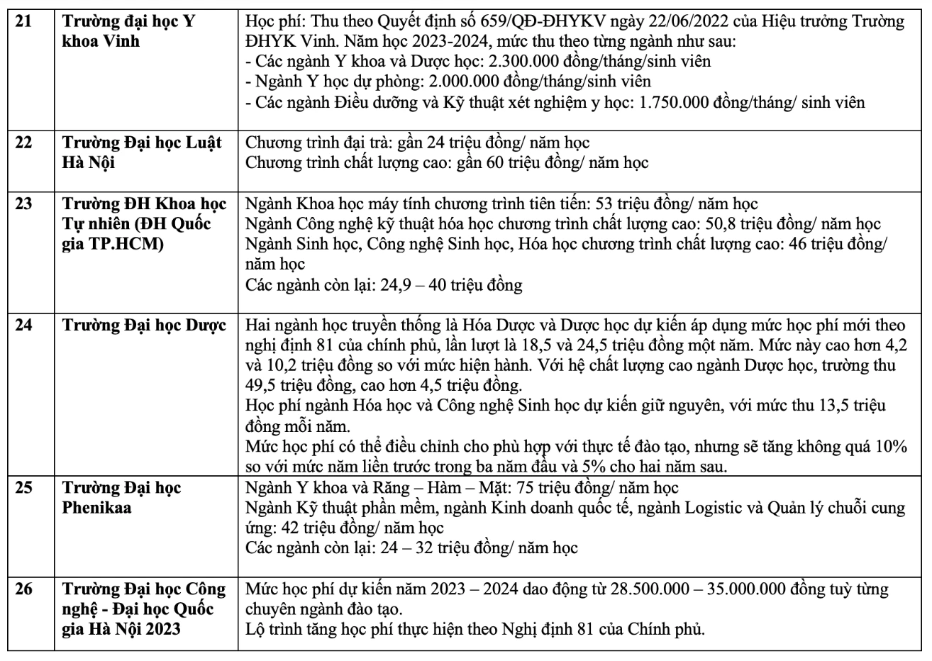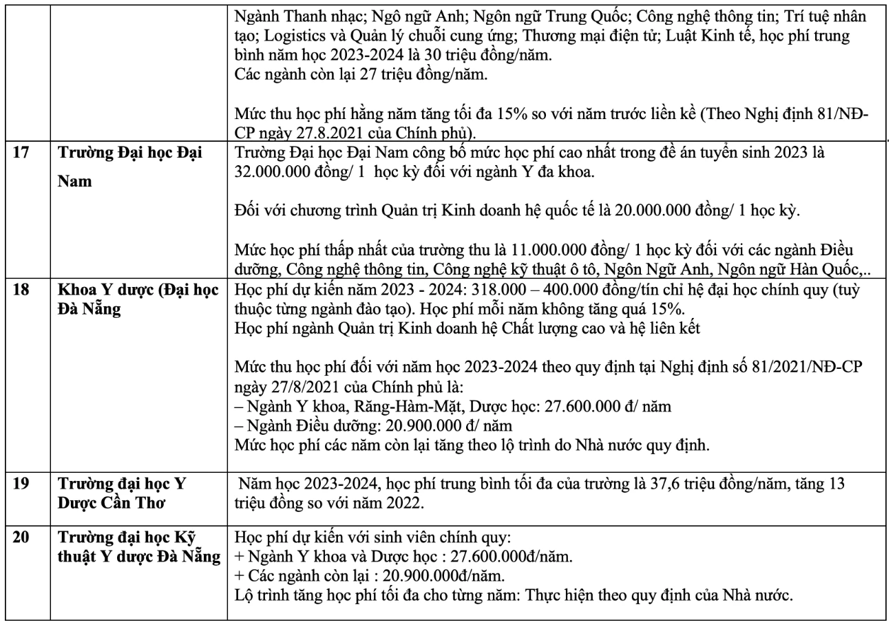 Chi tiết học phí các trường đại học năm 2023 như sau: