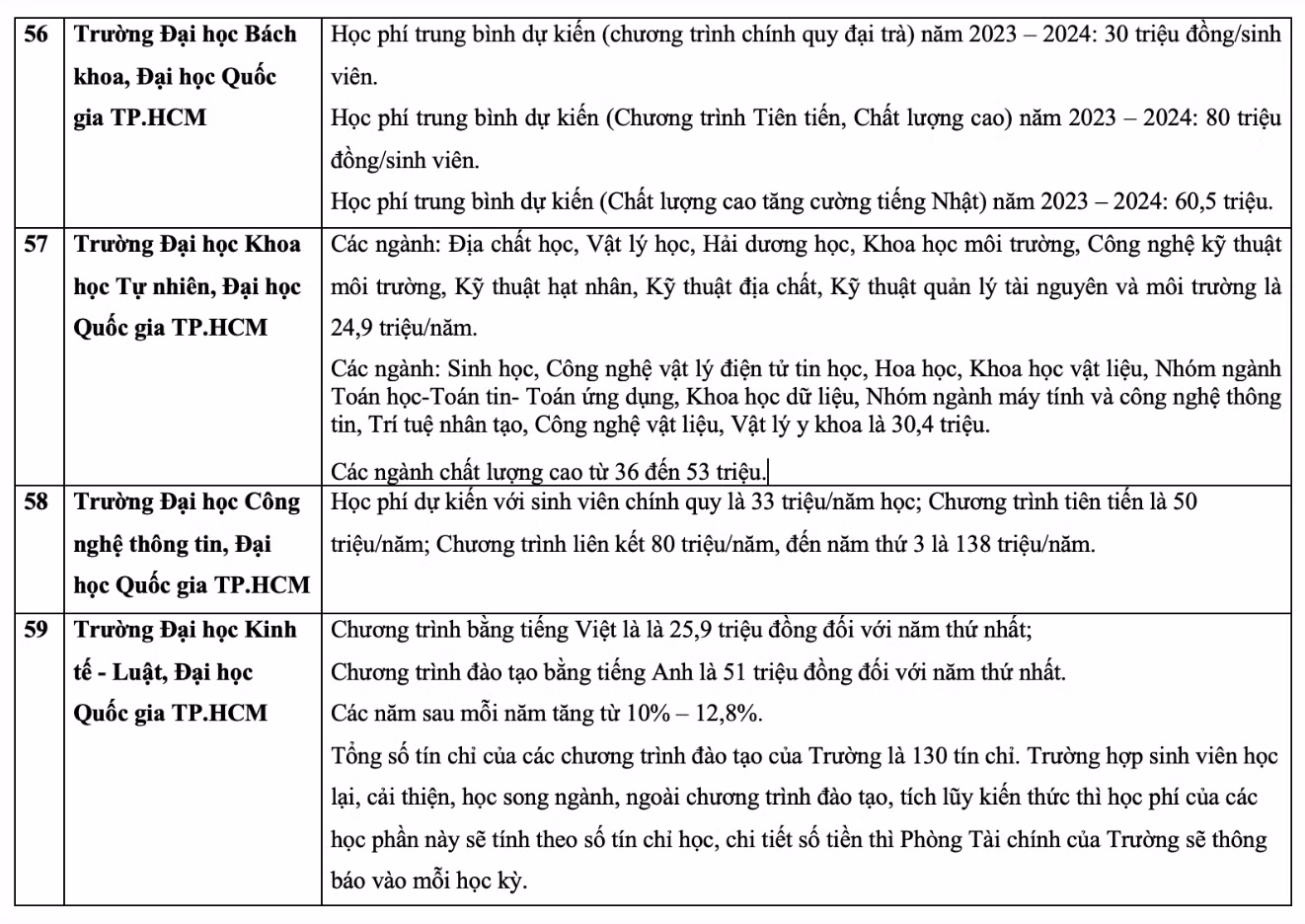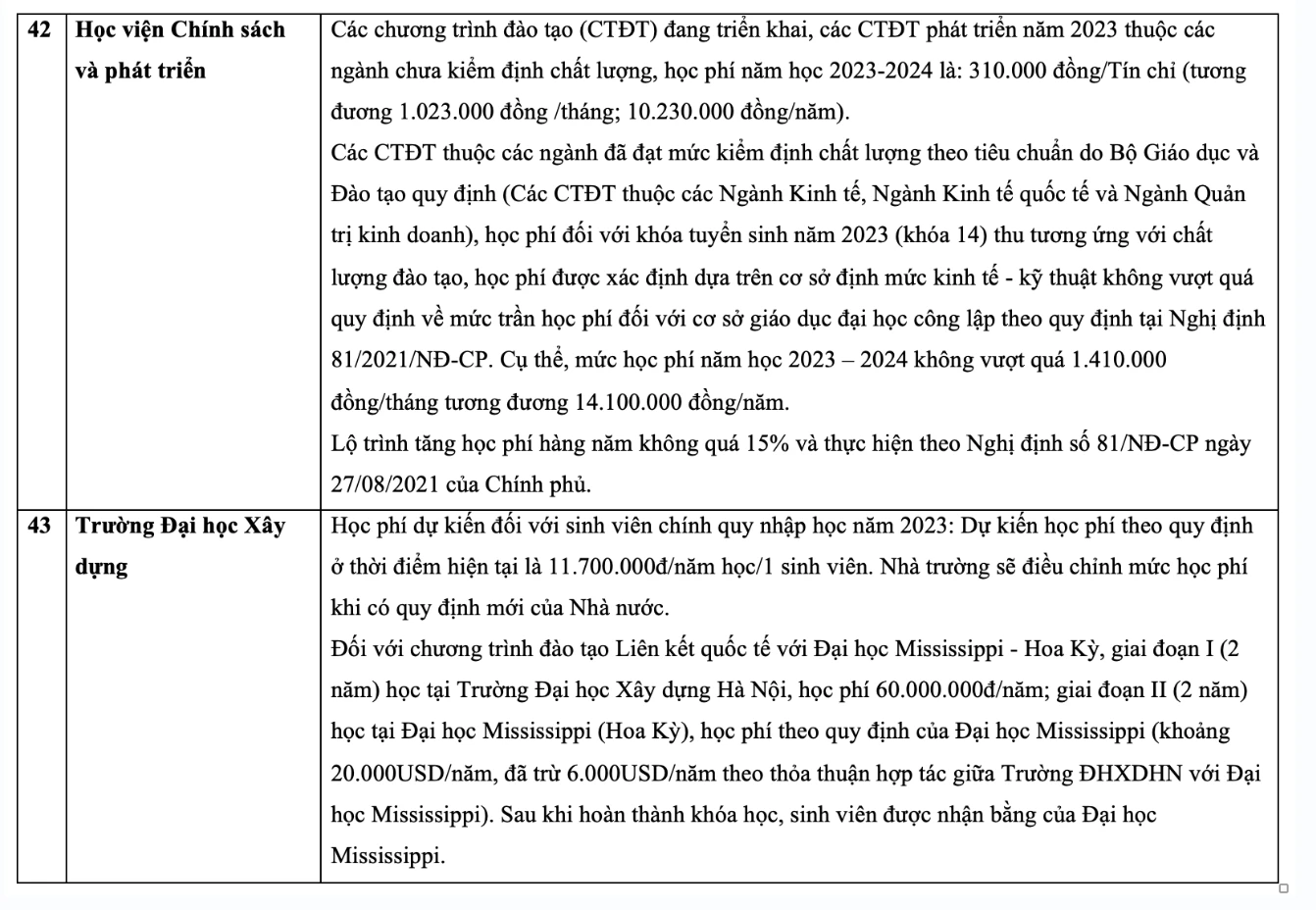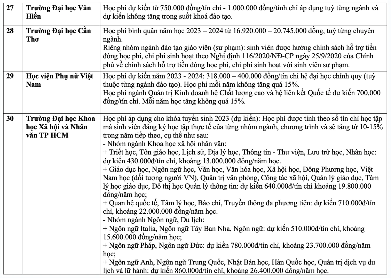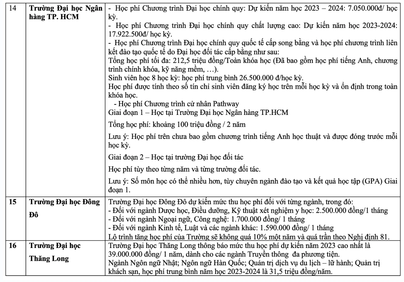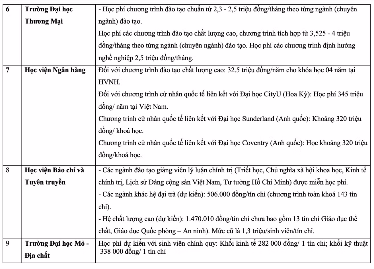 Chi tiết học phí các trường đại học năm 2023 như sau: