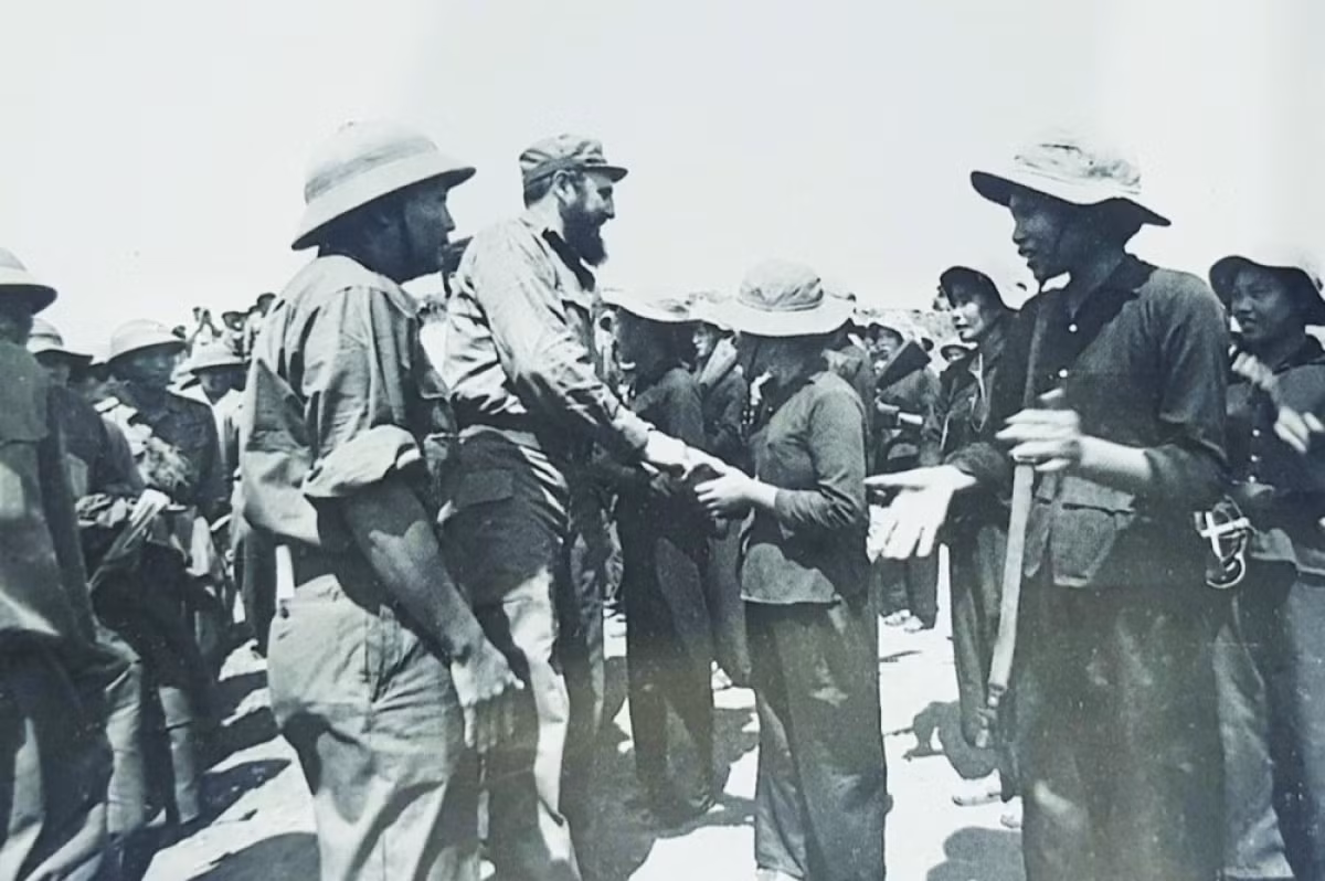 Chủ tịch Cuba Fidel Castro bắt tay chúc mừng nữ du kích tiêu biểu Hoàng Thị Chẫm ở căn cứ Dốc Miếu, huyện Gio Linh - Ảnh Tư liệu
