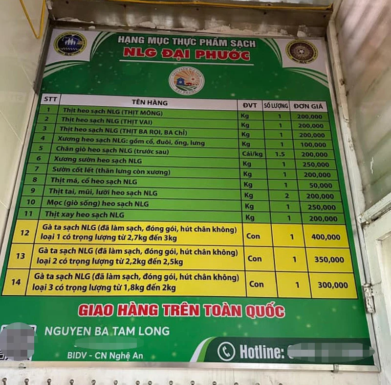 Bảng giá thịt lợn, gà của một cửa hàng NLG nằm ở TP Vinh (Nghệ An).