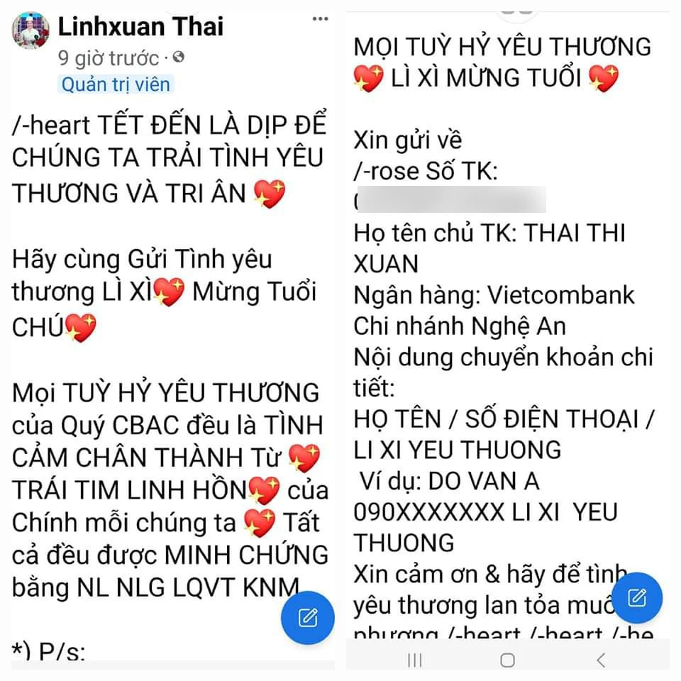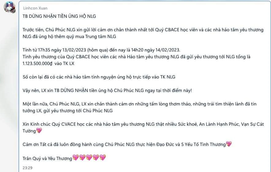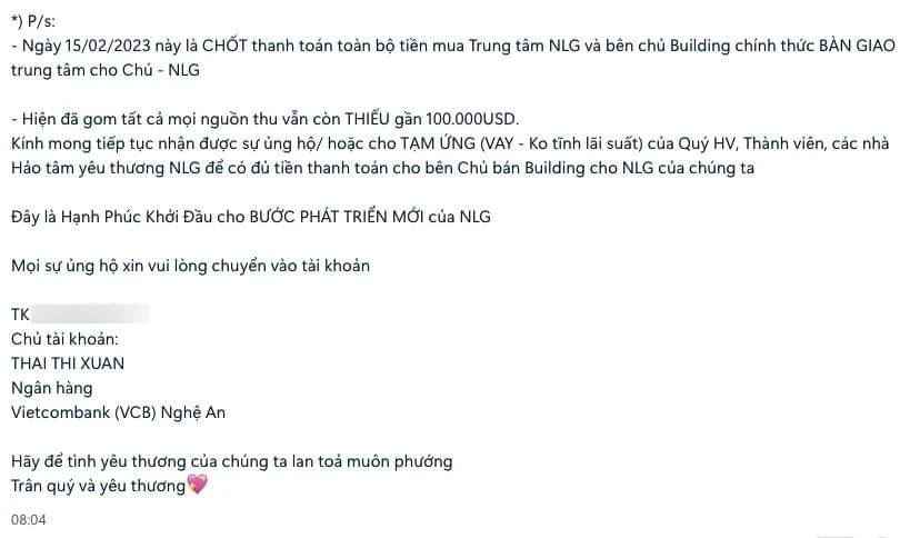 Trên fanpage công khai của nhóm này, bà Thái Thị Xuân còn đại diện cho chú Phúc đứng ra kêu gọi các thành viên ủng hộ hoặc tạm ứng cho vay không lãi suất để mua trụ sở cho NLG. Bà Xuân viết rằng, sau khi đã gom mọi nguồn thu, số tiền mua trụ sở vẫn còn thiếu… 100.000 USD (gần 2,4 tỷ đồng). Nhưng chỉ chưa đầy 1 ngày sau, bà tuyên bố tài khoản của bà đã nhận được hơn 1,1 tỷ đồng.