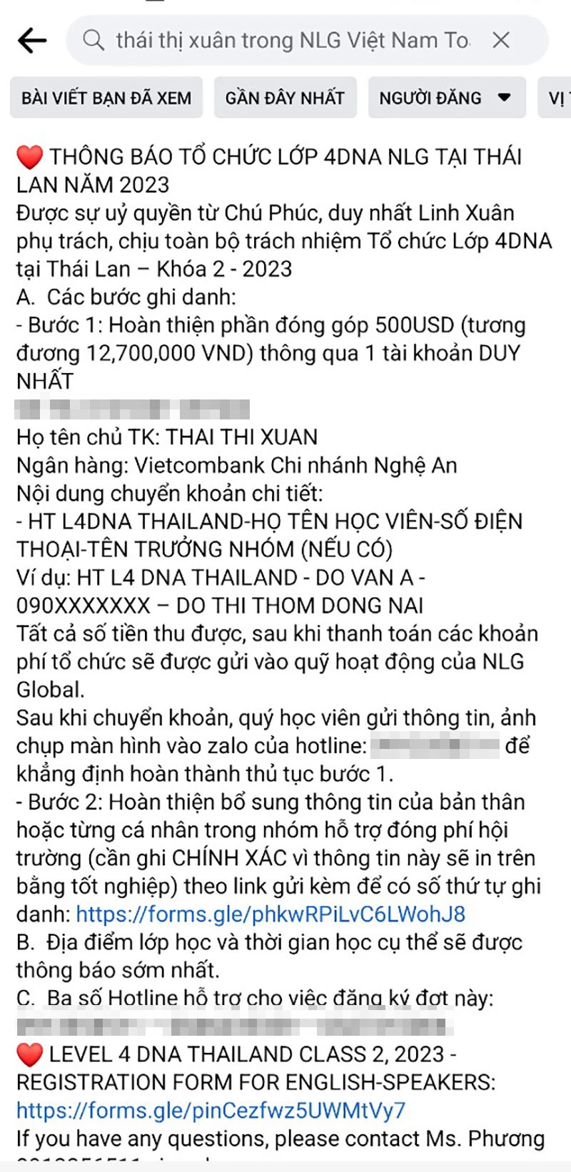 Giống như mẹ chồng chị Trang, mẹ đẻ chị Thu Hà (Hà Nội) cũng đang mê muội với NLG. Chị Hà kể, chị chỉ biết mẹ mình đi Thái Lan trước đúng 1 ngày. Lúc ấy chị mới nhớ ra bà từng gửi nhầm cho chị ảnh chụp màn hình giao dịch chuyển khoản 12,7 triệu đồng cho một người tên là Thái Thị Xuân. Về sau, chị mới biết số tiền 12,7 triệu đồng (tương đương 500 USD) thực ra là tiền đóng phí thuê hội trường, còn tổng số tiền phải bỏ ra cho chuyến đi này lên tới hơn 26 triệu đồng, chưa tính các khoản chi tiêu cá nhân và ủng hộ tự nguyện cho chuyến đi.