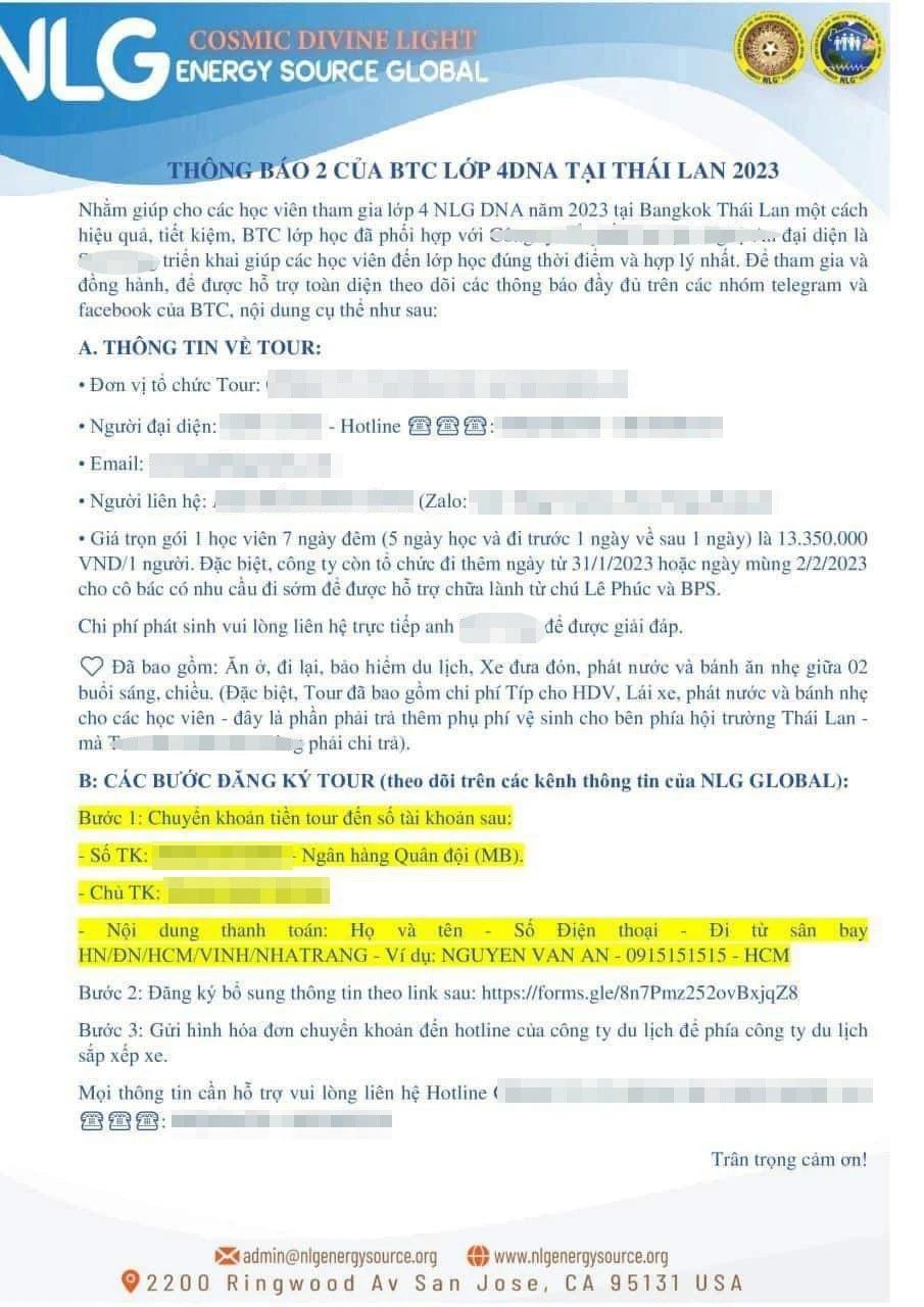 Riêng năm 2022, NLG đã tổ chức 2 hội thảo tại Malaysia và Thái Lan, thu hút lần lượt khoảng 1.500 và 2.390 người tham gia. Sang năm nay, nhóm này lại tiếp tục tổ chức hội thảo tại Thái Lan vào đầu tháng 2. Hội thảo này cũng thu hút lên tới gần 2.400 người, gần như toàn bộ là người Việt Nam.