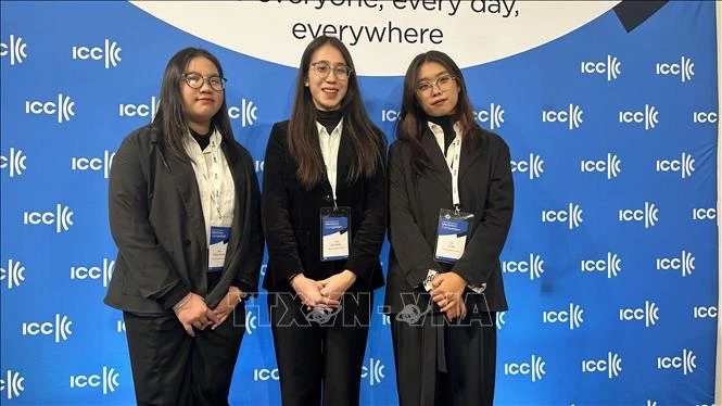 Thí sinh Việt Nam tại ICCMC-19 (Từ trái sang: Bạn Phạm Phương Anh, Bùi Ngọc Linh, Tạ Mai Chi).