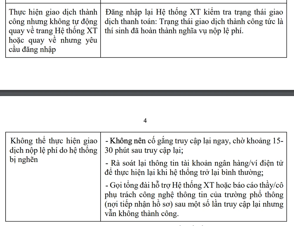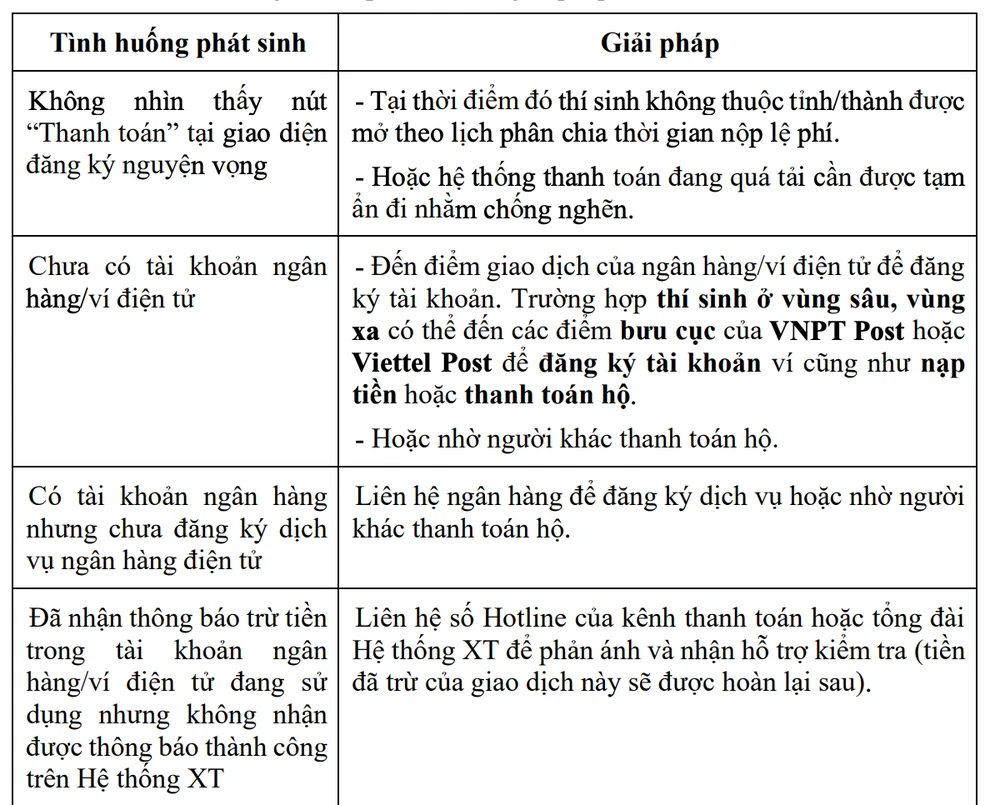 Trong trường hợp thí sinh/phụ huynh đã nhận được thông báo trừ tiền (trong tài khoản ngân hàng/ví điện tử đang sử dụng) mà không nhận được thông báo thành công trên Hệ thống xét tuyển, đề nghị thí sinh/phụ huynh liên hệ số điện thoại đường dây nóng của kênh thanh toán hoặc tổng đài Hệ thống xét tuyển để phản ánh và nhận hỗ trợ kiểm tra, hướng dẫn. Trong trường hợp này, Bộ Giáo dục và Đào tạo đề nghị thí sinh không tự ý tiếp tục thanh toán. Trường hợp xảy ra thanh toán trùng thì thí sinh sẽ được hoàn tiền thanh toán trùng sau khi kết thúc đợt nộp lệ phí.