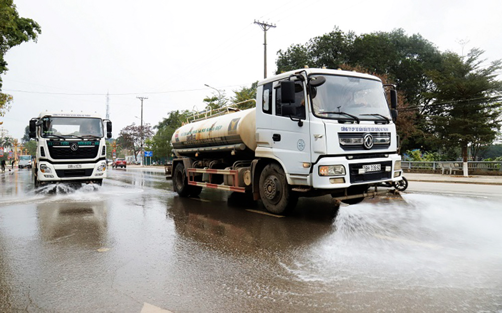 Công ty cổ phần Môi trường và Năng lượng Nam Thành bố trí xe bồn để rửa đường phố.