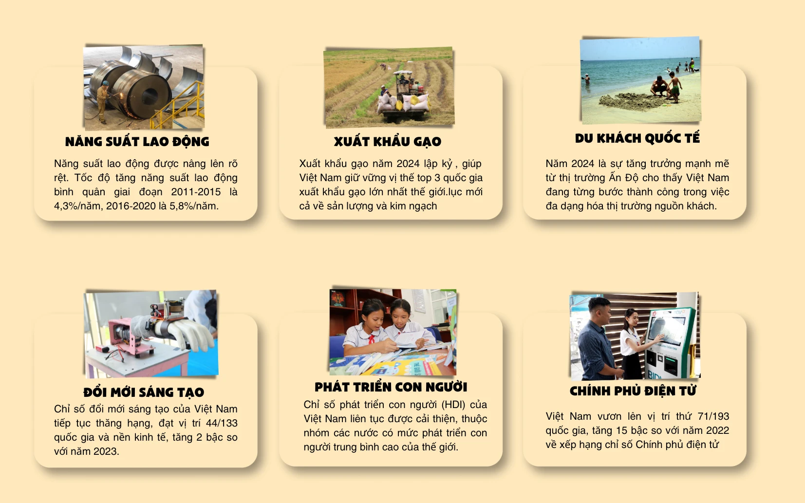 Việt Nam cũng đạt được những thành tựu đáng kể trong lĩnh vực chính phủ điện tử. Theo Báo cáo khảo sát Chính phủ điện tử năm 2024 của Liên hợp quốc, Việt Nam vươn lên vị trí thứ 71/193 quốc gia, tăng 15 bậc so với năm 2022, đây là lần đầu tiên Việt Nam được xếp vào nhóm EGDI ở mức Rất cao và vươn lên vị trí xếp hạng cao nhất kể từ khi bắt đầu tham gia đánh giá EGDI của Liên hợp quốc năm 2003. Điều này phản ánh sự cải thiện mạnh mẽ về hạ tầng công nghệ, năng lực cung cấp dịch vụ công và sự chuyển đổi số toàn diện trong bộ máy hành chính nhà nước.