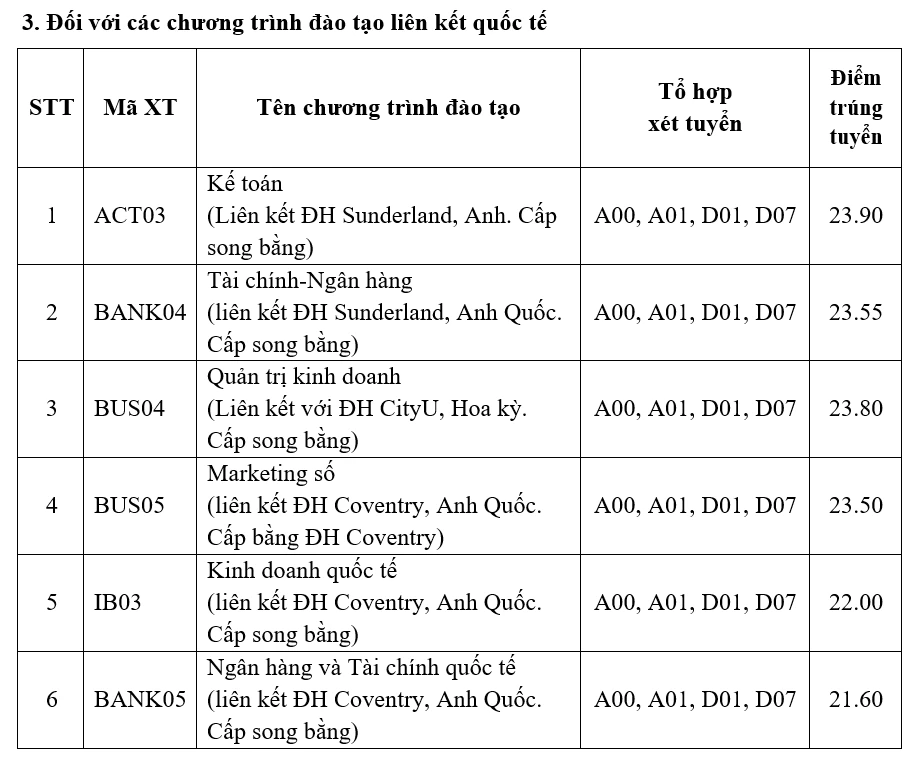 Điểm trúng tuyển các nhóm ngành tương đối đồng đều và có mức điểm cao nhất là 28,5 của tổ hợp D01 đối với ngành Ngôn ngữ Trung Quốc - chuyên ngành Tiếng Trung Thương mại, tiếp theo là mức điểm 28,3 của tổ hợp A00 đối với ngành Kinh tế - chuyên ngành Kinh tế đối ngoại và chuyên ngành Thương mại quốc tế, mức điểm 28,0 của tổ hợp A00 đối với ngành Kinh tế quốc tế.