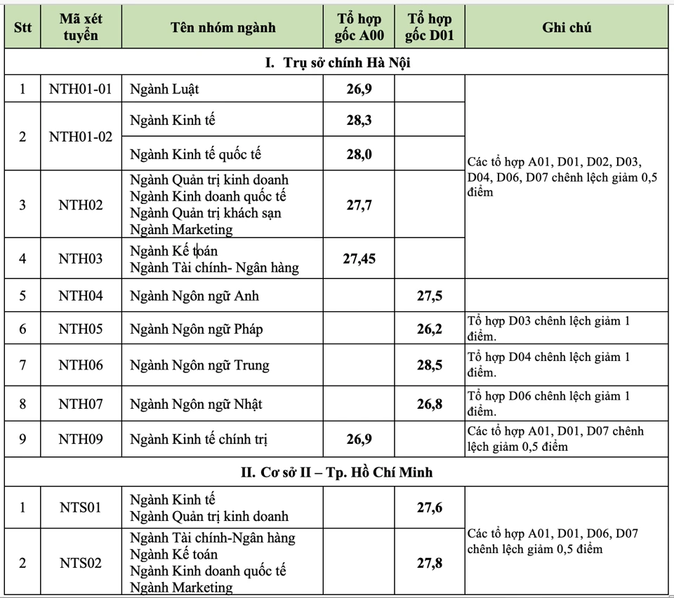 Điểm chuẩn Trường ĐH Ngoại thương năm 2023