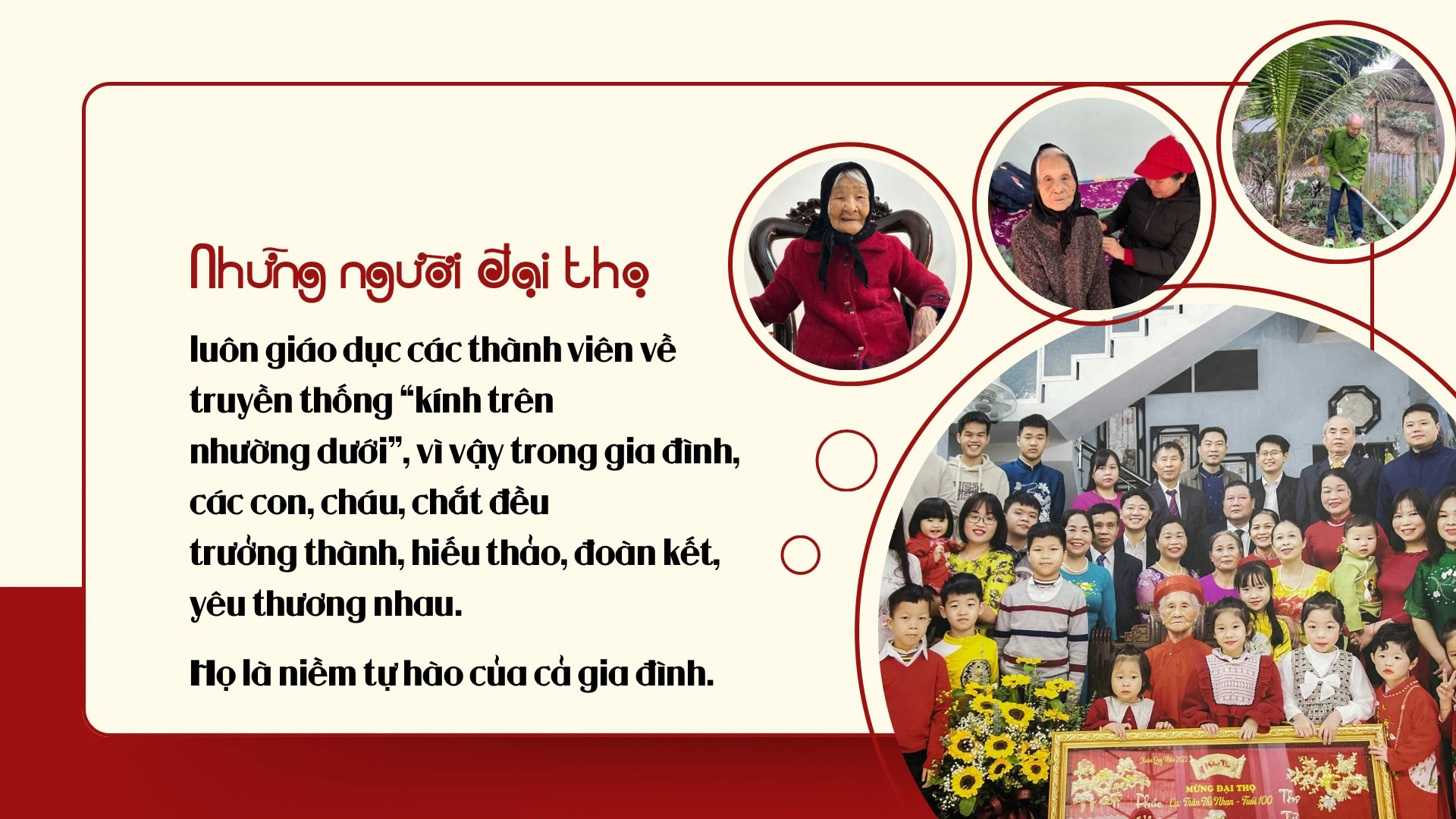 Ông Nguyễn Thanh Nhàn, con trai cụ cho biết: Mẹ tôi là niềm tự hào của cả gia đình, còn mẹ, chúng tôi còn nơi để trở về nên các thành viên trong gia đình luôn trân quý những khoảnh khắc bên mẹ. Mẹ chính là tấm gương sáng ngời về hình mẫu người phụ nữ Việt Nam hết lòng hi sinh vì chồng, con. Nhìn mẹ sinh hoạt, ăn uống lành mạnh, các thành viên trong gia đình cũng học tập được nhiều điều bổ ích.