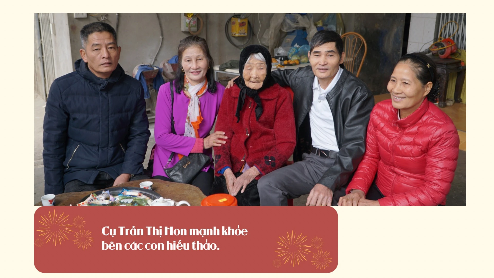Cũng ở thôn An Thành, xã Quang Kim, cụ Trần Thị Hon tròn 100 tuổi vẫn đi lại nhanh nhẹn. Cụ ra ngoài phòng khách trò chuyện với các con cháu nhân dịp đầu xuân năm mới. Trong không khí vui vẻ, rộn ràng tiếng cười, cụ kể lại kỷ niệm một thời đi tải gạo phục vụ kháng chiến, những khó khăn khi chồng mất để lại 4 người con thơ.