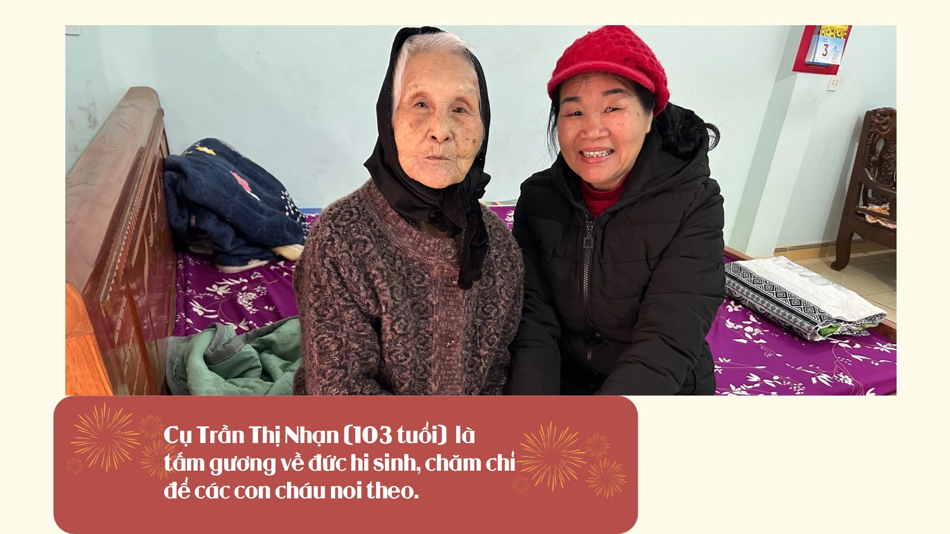 Trong căn nhà nhỏ bên cạnh đường thuộc thôn An Thành, xã Quang Kim, cụ Trần Thị Nhạn, 103 tuổi ngày nào cũng ngồi ở chiếc giường gần cửa, nhìn ngắm dòng người qua lại. Mắt đã mờ, chân cũng chậm, đi lại phải có người dìu nhưng cụ không muốn phiền con cháu nên ở riêng, các con cháu thay phiên nhau đến chăm sóc cụ.