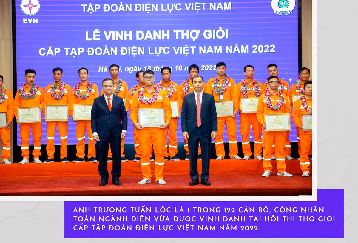 Anh Trương Tuấn Lộc là 1 trong 122 cán bộ, công nhân toàn ngành điện vừa được vinh danh tại Hội thi thợ giỏi cấp Tập đoàn Điện lực Việt Nam năm 2022 và vinh dự được Chủ tịch nước gặp mặt, động viên. Anh Lộc tâm sự: Hội thi là trải nghiệm quý giá, giúp mình nhận ra vẫn còn nhiều điều phải học hỏi mới đáp ứng được yêu cầu công việc ngày càng đòi hỏi cao về sự an toàn, chính xác.
