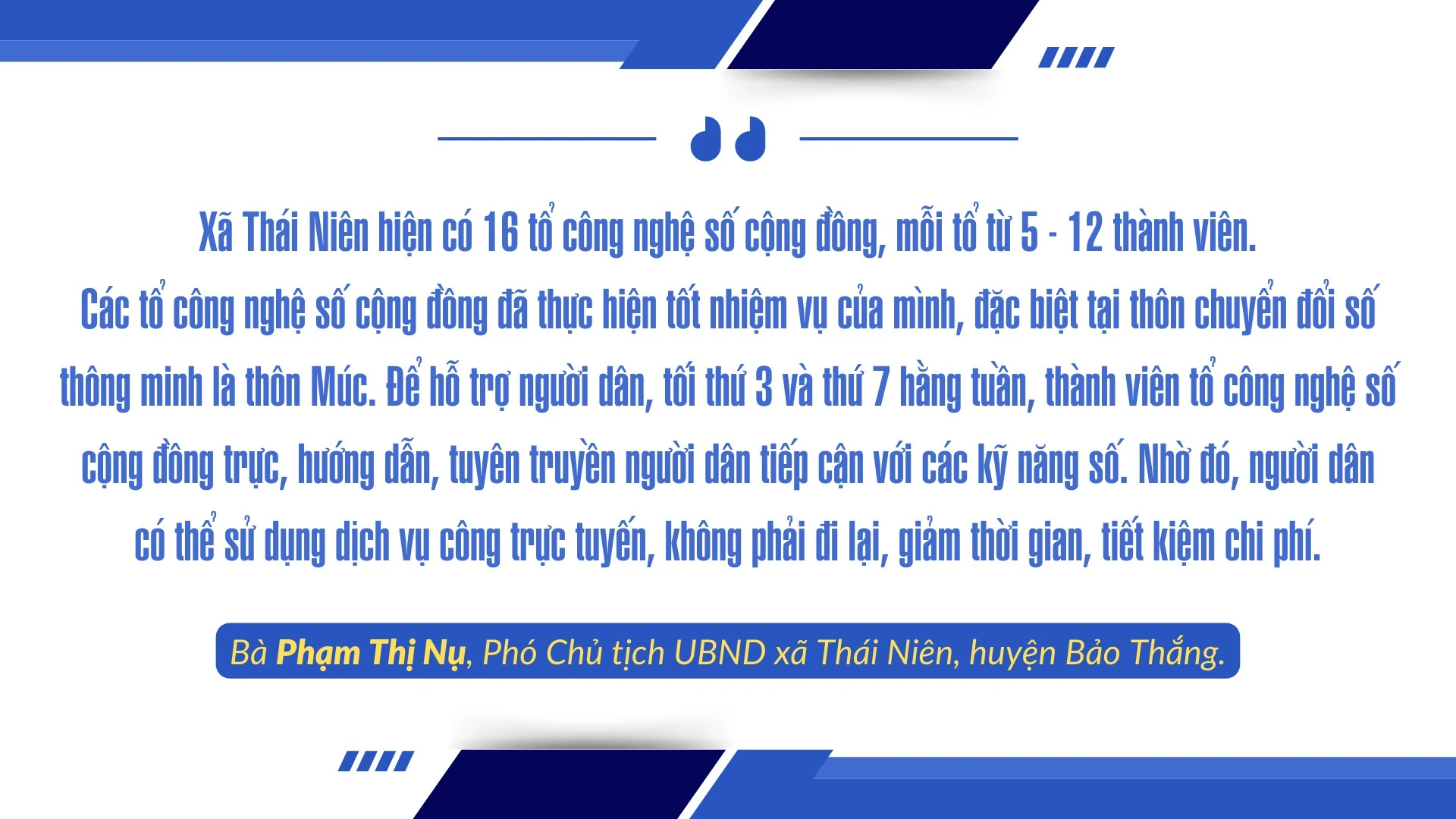 Sự phối hợp chặt chẽ giữa chính quyền xã Thái Niên và các tổ công nghệ số cộng đồng đã mang lại những kết quả tích cực. Không chỉ tập trung hướng dẫn các thủ tục hành chính cơ bản, thời gian qua, các tổ công nghệ số cộng đồng còn giúp người dân làm quen với dịch vụ công trực tuyến, giảm thiểu sự phụ thuộc vào các thủ tục giấy tờ truyền thống. Điều này giúp giảm bớt áp lực cho các cơ quan hành chính và nâng cao sự hài lòng của người dân.