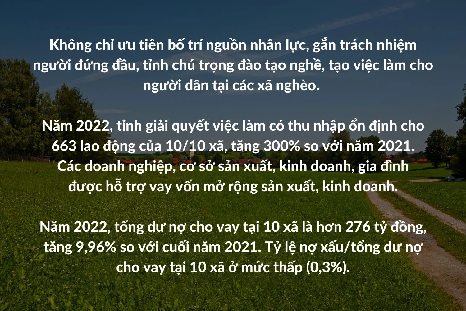 Lĩnh vực giáo dục và đào tạo, y tế tiếp tục được quan tâm đầu tư và duy trì ổn định về số lượng, chất lượng. Tỉnh đã thực hiện giải pháp tập trung đầu tư các công trình hạ tầng thiết yếu, đảm bảo đạt các tiêu chí nông thôn mới về hạ tầng vùng nông thôn ở 10 xã có tỷ lệ hộ nghèo cao. Trước hết, ưu tiên nguồn lực đầu tư các công trình giao thông nông thôn, tiếp đến là hệ thống trường học, trạm y tế, công trình thủy lợi và các công trình cấp điện sinh hoạt… Năm 2022, nhiều công trình hạ tầng của 10 xã nghèo đã được đầu tư xây dựng, góp phần nâng cao đời sống vật chất, tinh thần cho người dân.