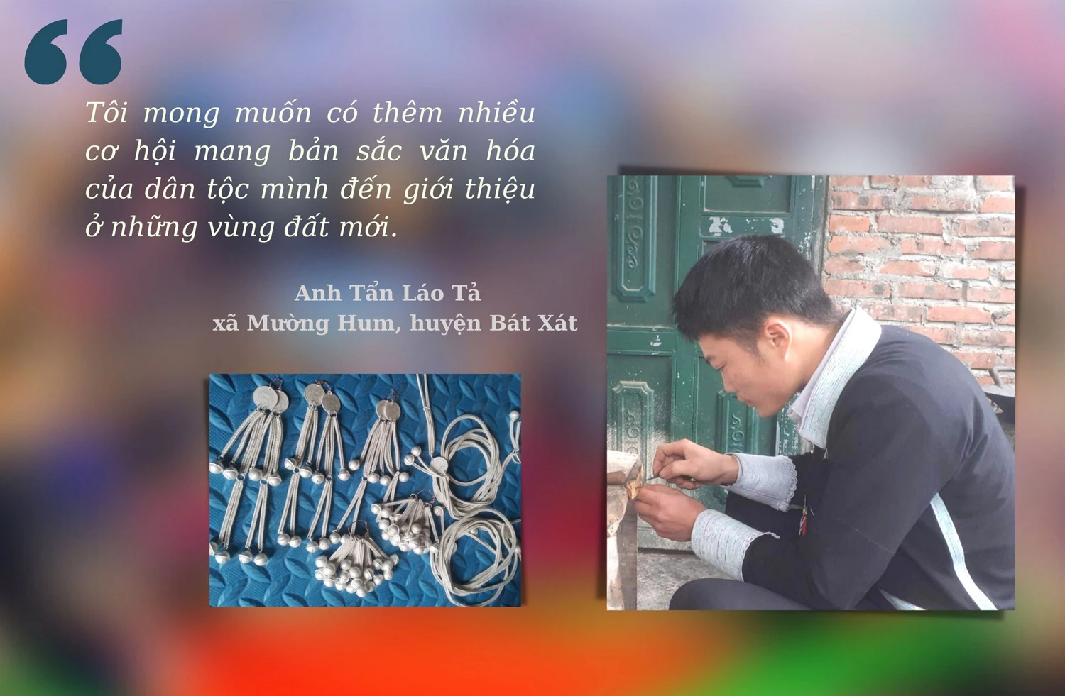 Trước đây, anh Tẩn Láo Tả (ở thôn Séo Pờ Hồ, xã Mường Hum, huyện Bát Xát) chỉ nghĩ rằng, khi nghĩ lớn lên sẽ theo bố học chạm khắc bạc của người Dao đỏ, gìn giữ nghề truyền thống của đồng bào mình. Vậy nhưng hôm nay, ước mong của anh Tả đã lớn hơn, đó là mang bản sắc văn hóa của quê hương đến nhiều vùng đất mới.