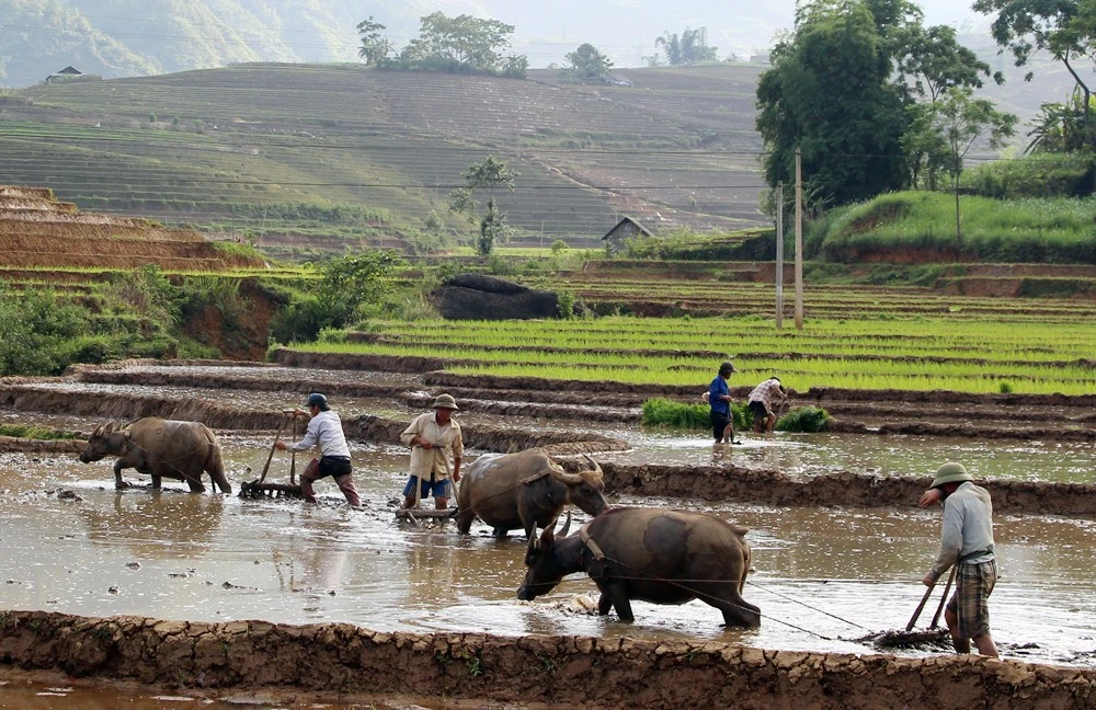 | Nông dân Trịnh Tường (Bát Xát) làm đất, gieo cấy lúa mùa sớm. |
