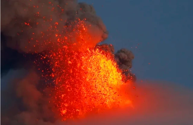 Núi lửa Mayon phun dung nham nóng đỏ trong một đợt phun trào nhìn từ thành phố Legazpi, tỉnh Albay, cách thủ đô Manila, Philippines khoảng 340 km về phía Đông Nam.