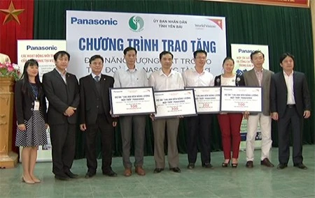 Đại diện Panasonic Việt Nam và Tổ chức Tầm nhìn thế giới tại Việt nam trao tặng 100 đèn năng lượng mặt trời cho người dân huyện Yên Bình.