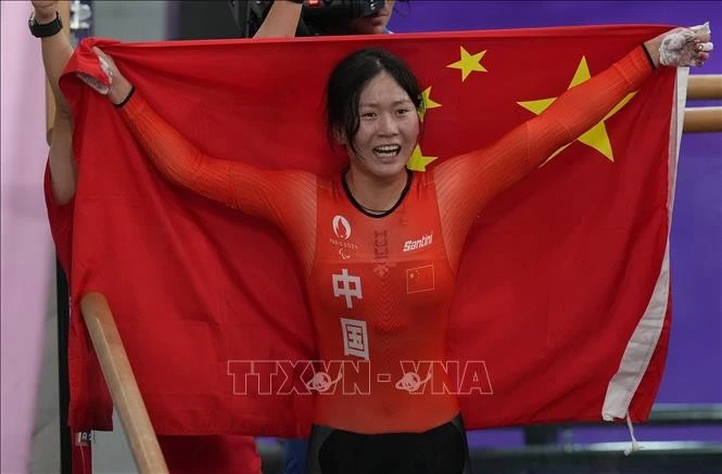 Vận động viên Wang Xiaomei của Trung Quốc giành HCV nội dung xe đạp lòng chảo rượt đuổi 3000m cá nhân nữ hạng C1-3 tại Paralympic Paris 2024, Pháp, ngày 29/8/2024. Ảnh: THX/TTXVN