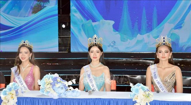 Hoa hậu và hai Á hậu của cuộc thi Hoa hậu du lịch Việt Nam 2024 tham gia họp báo sau đăng quang.