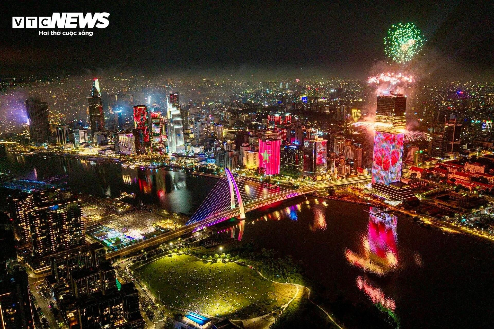 Trên nền trời đêm, pháo hoa tầm cao bung nở rực rỡ, đan xen sắc đỏ, vàng, xanh, tím… vẽ nên bức tranh lung linh, huyền ảo bên dòng sông Sài Gòn.