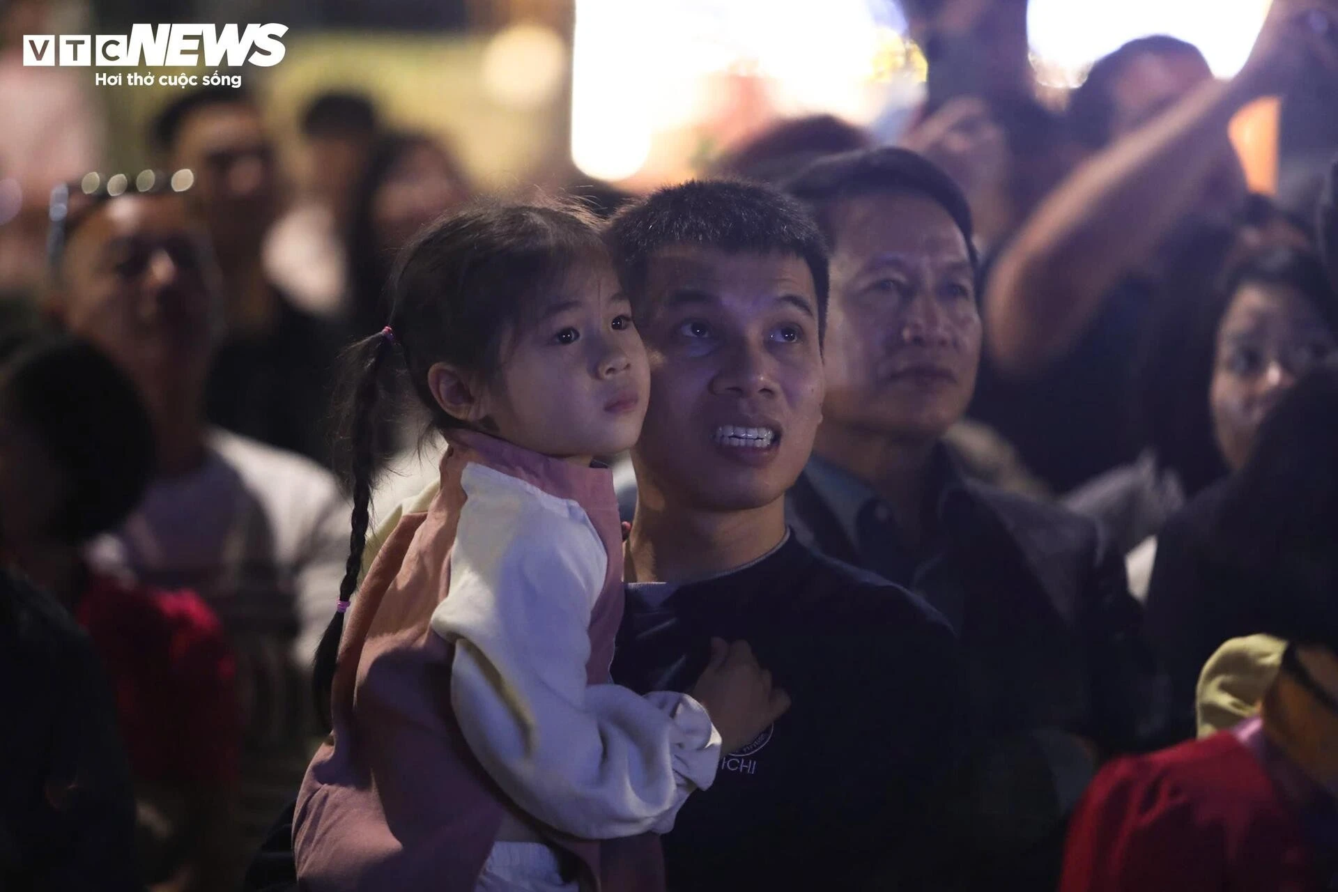 Em bé được ba cõng lên xem pháo hoa.